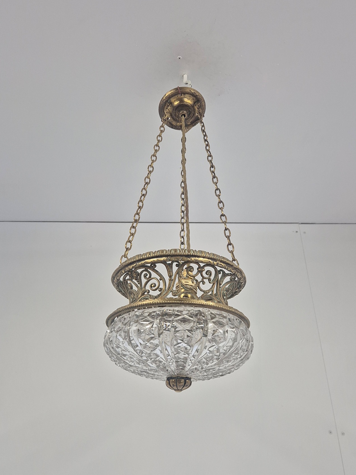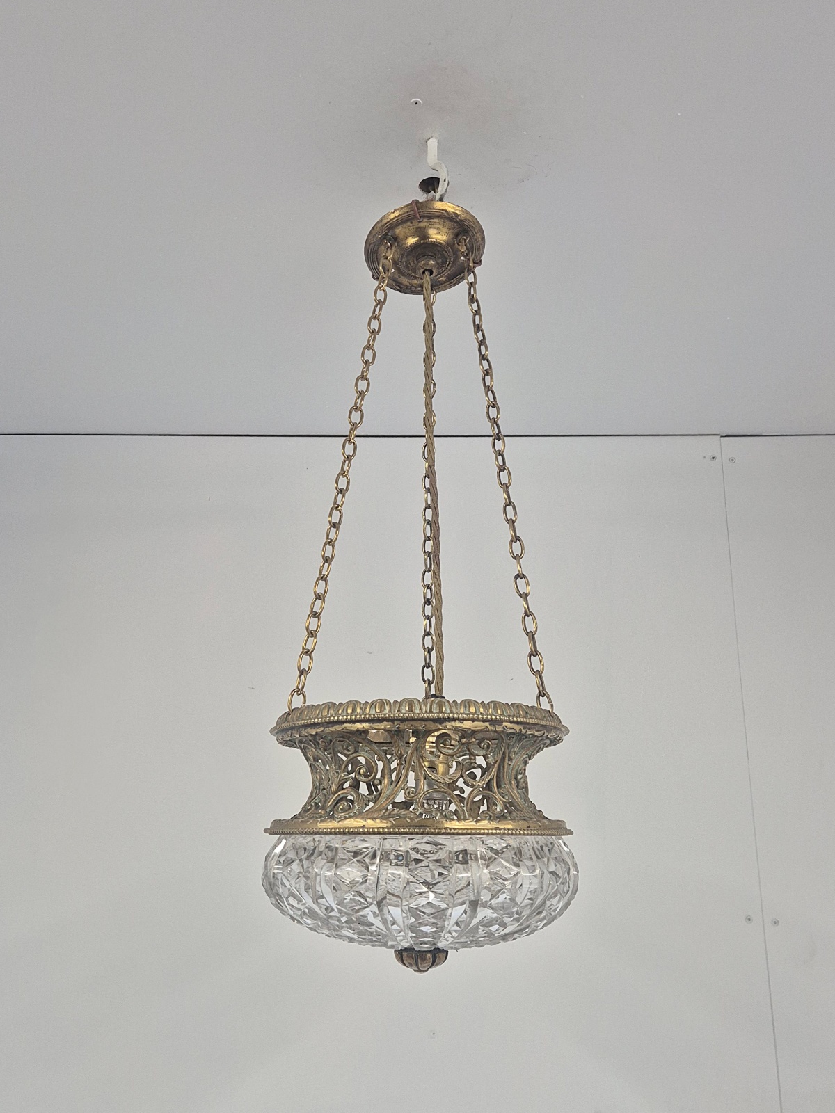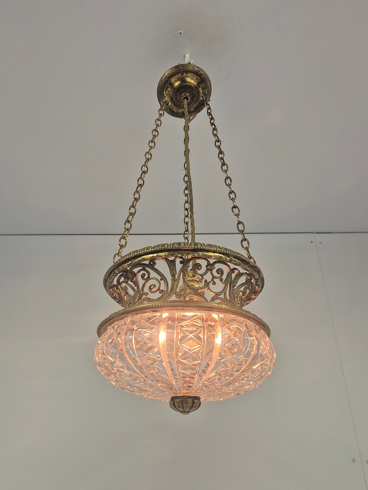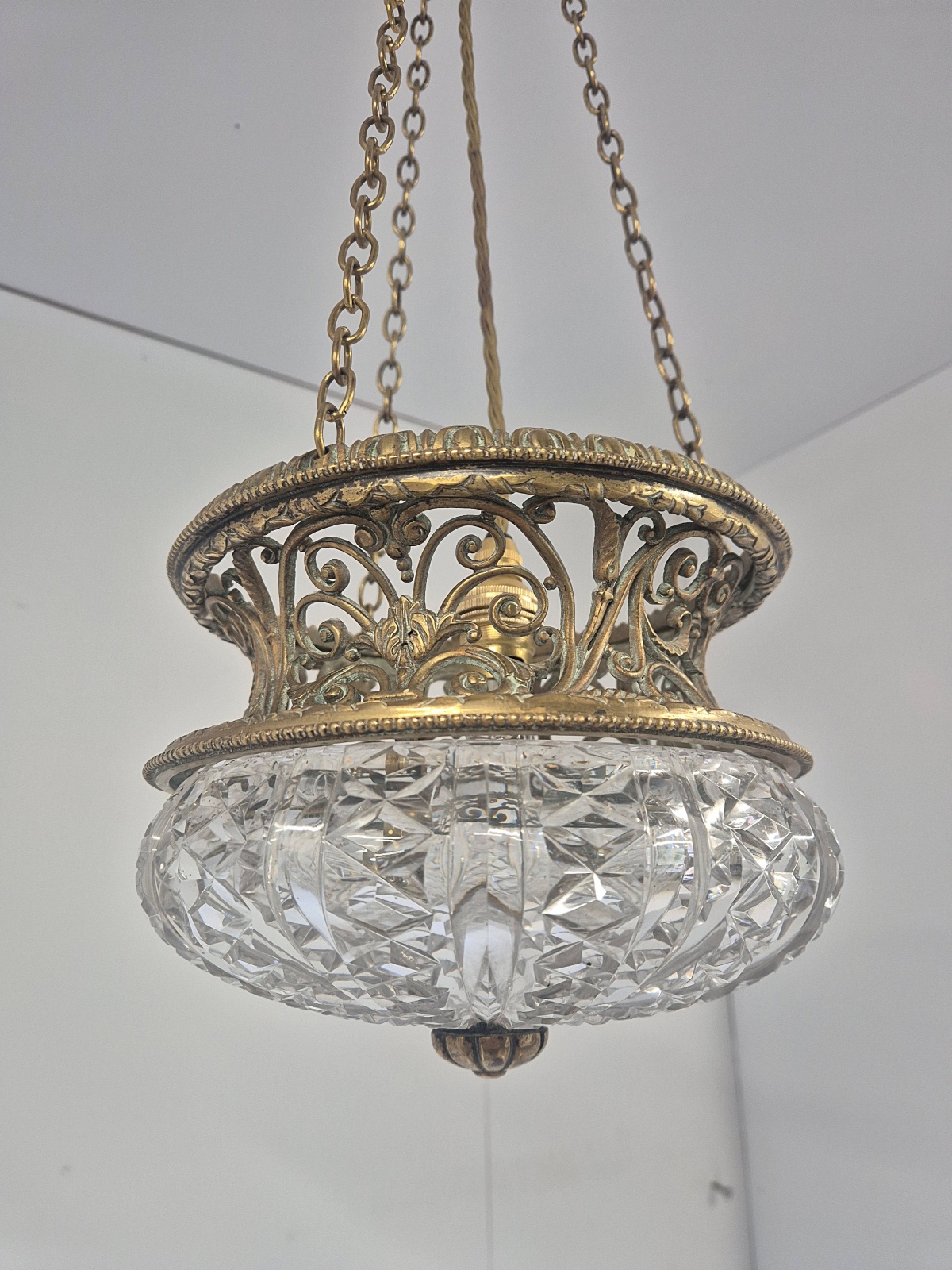 Product Code: JAL1285A rare Edwardian cut-glass and brass lantern almost certainly by F & C Osler, Birmingahm but apparently unsigned. The good quality lattice framework holds the original cut-glass lampshade with central finial. The light maintains its original chain and ceiling rose for suspension. England, c.1910.