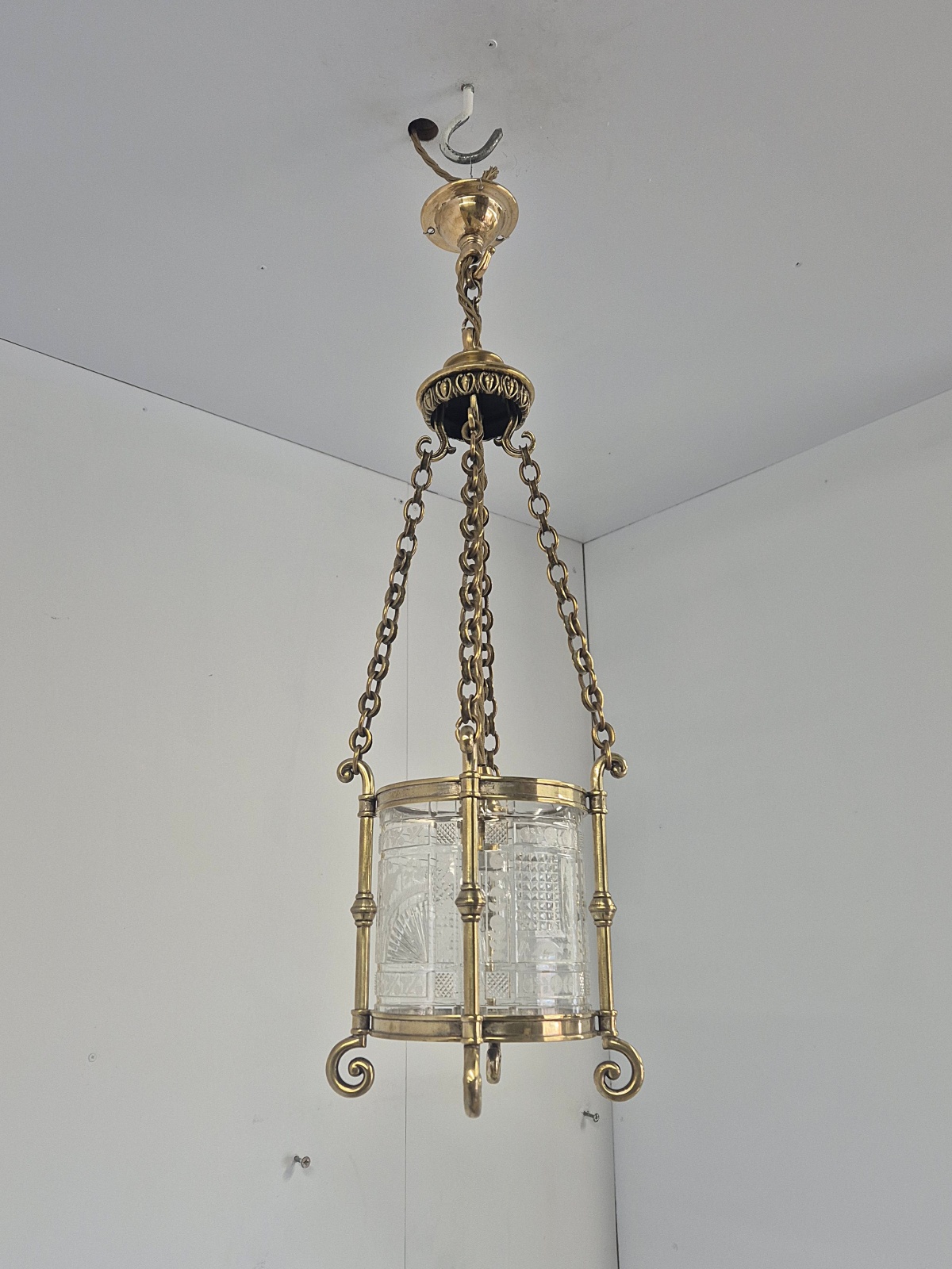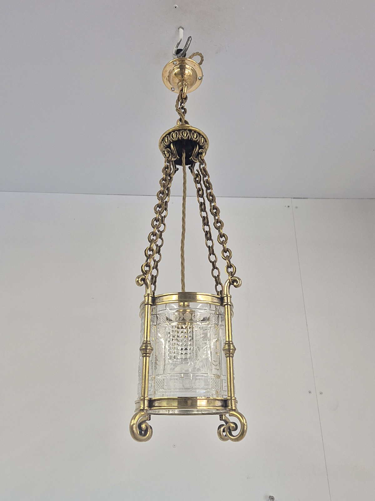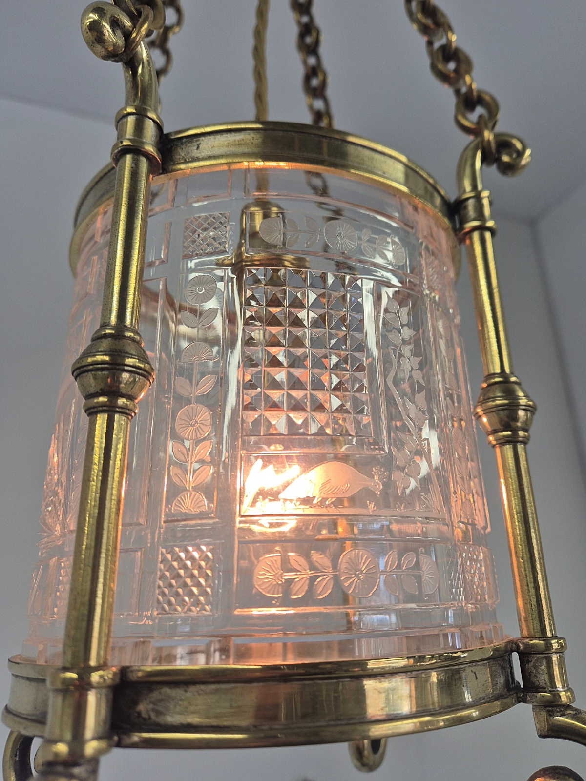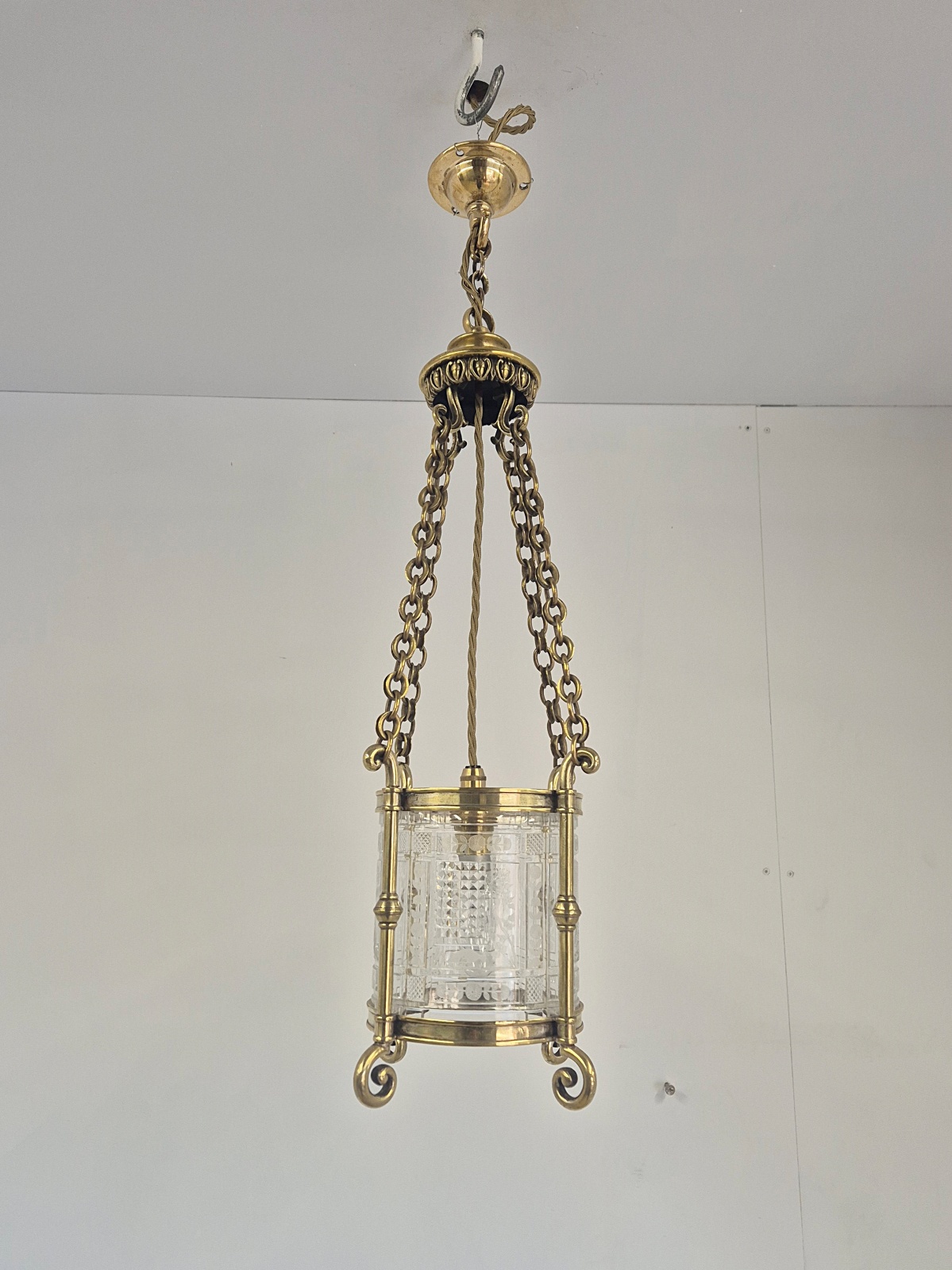 Product Code: JAL1243A rare Edwardian cut-glass and brass lantern almost certainly by F & C Osler, Birmingahm but apparently unsigned. Thegood quality cast brass metal-work holds the signature cut & acid-etched crystal-glass cylinder. It is intricately designed with peacock, flower & leaf garlands. England, c.1910.