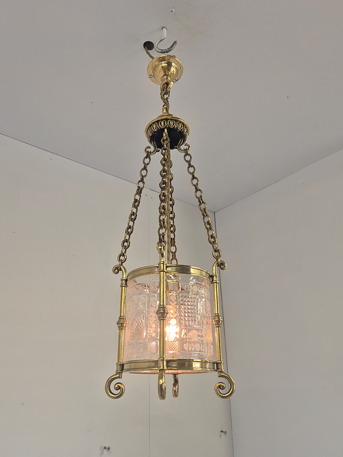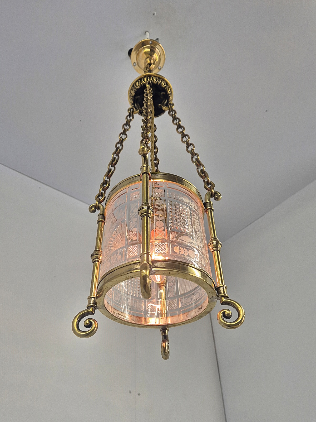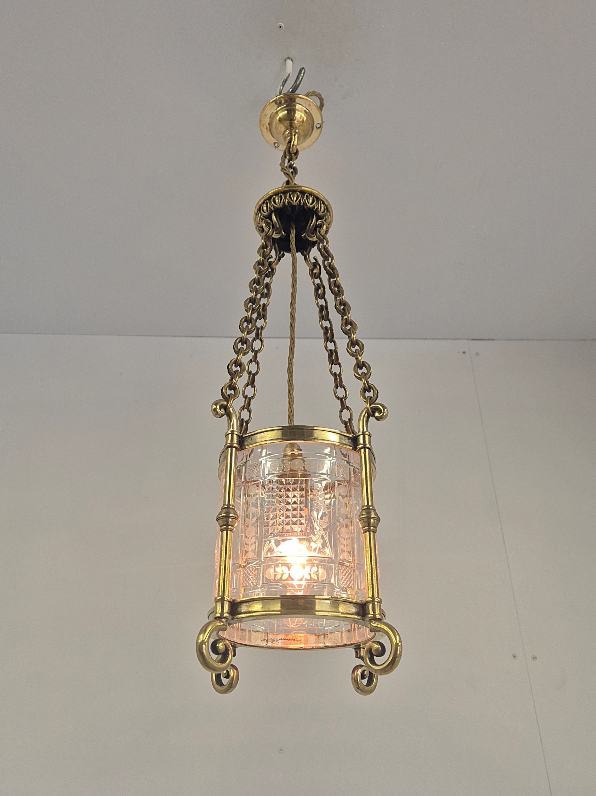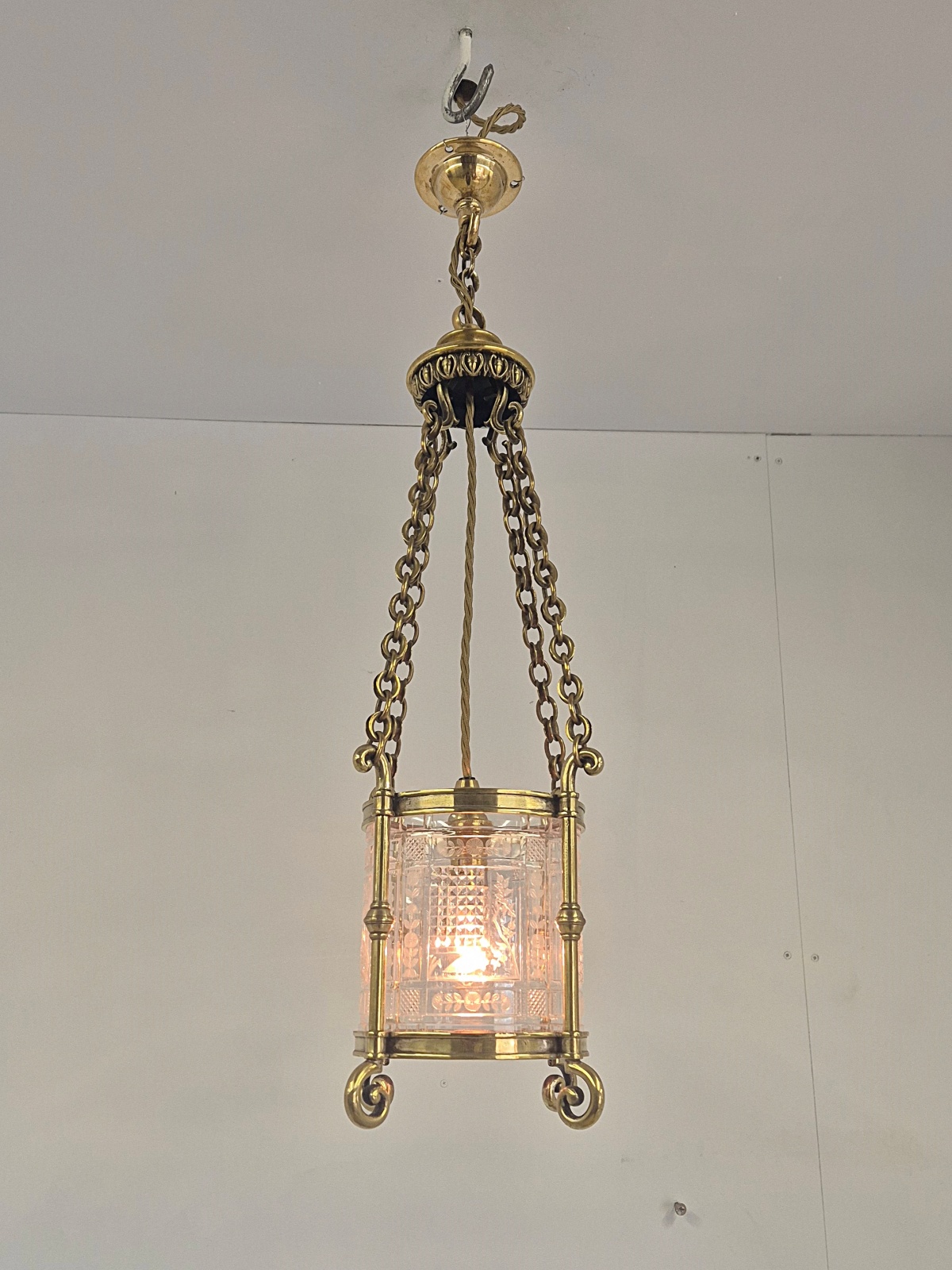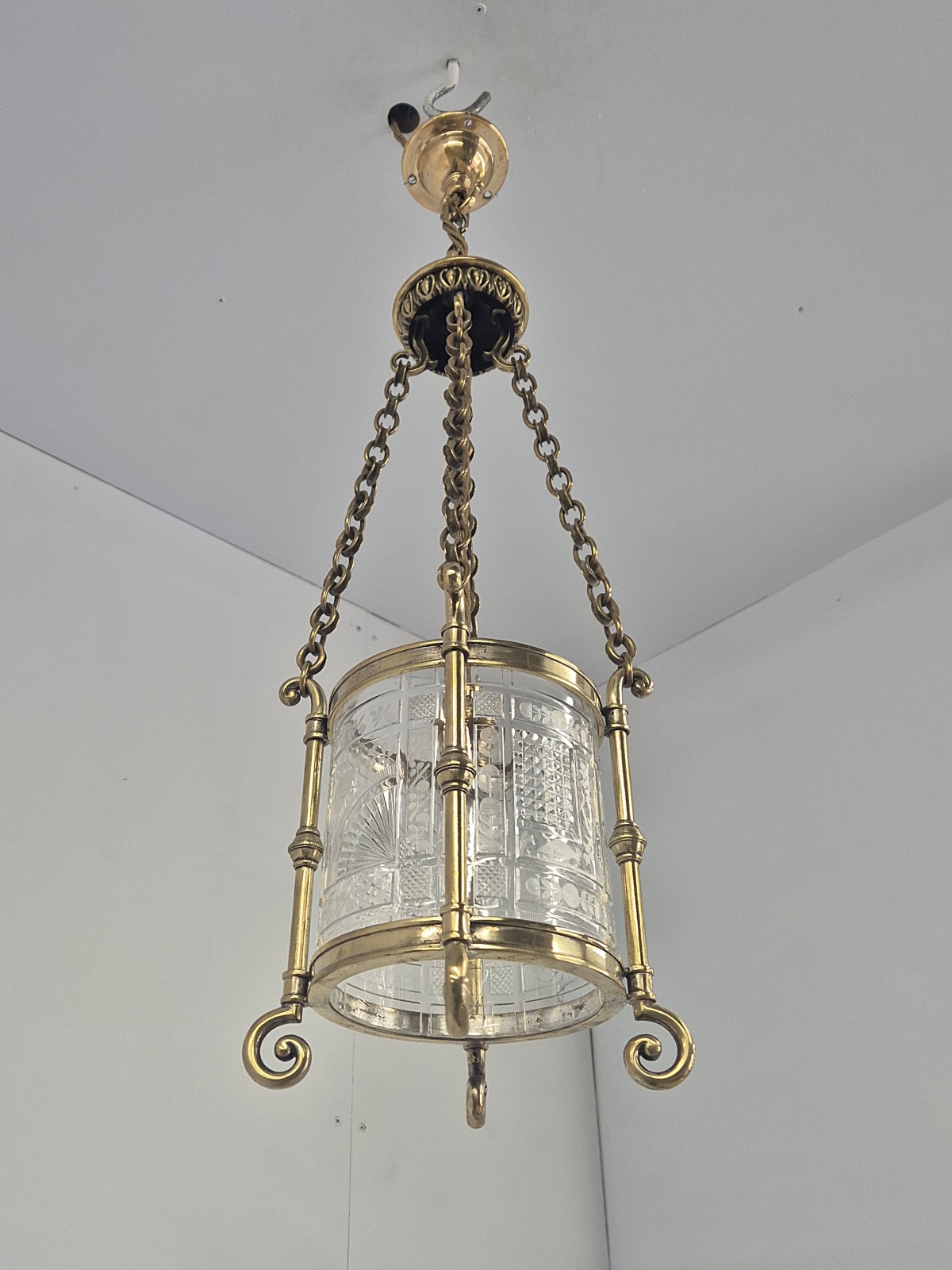 Product Code: JAL1243A rare Edwardian cut-glass and brass lantern almost certainly by F & C Osler, Birmingahm but apparently unsigned. Thegood quality cast brass metal-work holds the signature cut & acid-etched crystal-glass cylinder. It is intricately designed with peacock, flower & leaf garlands. England, c.1910.