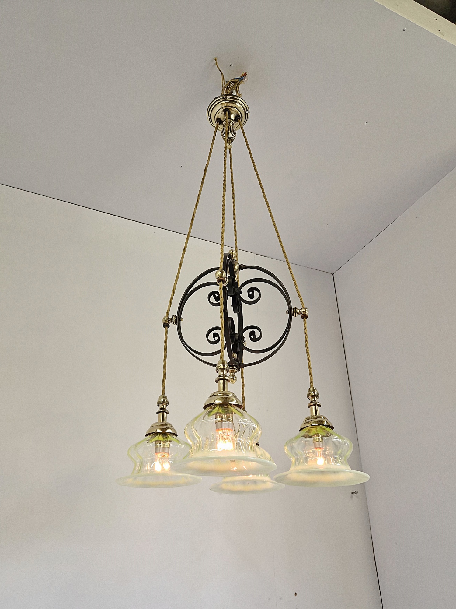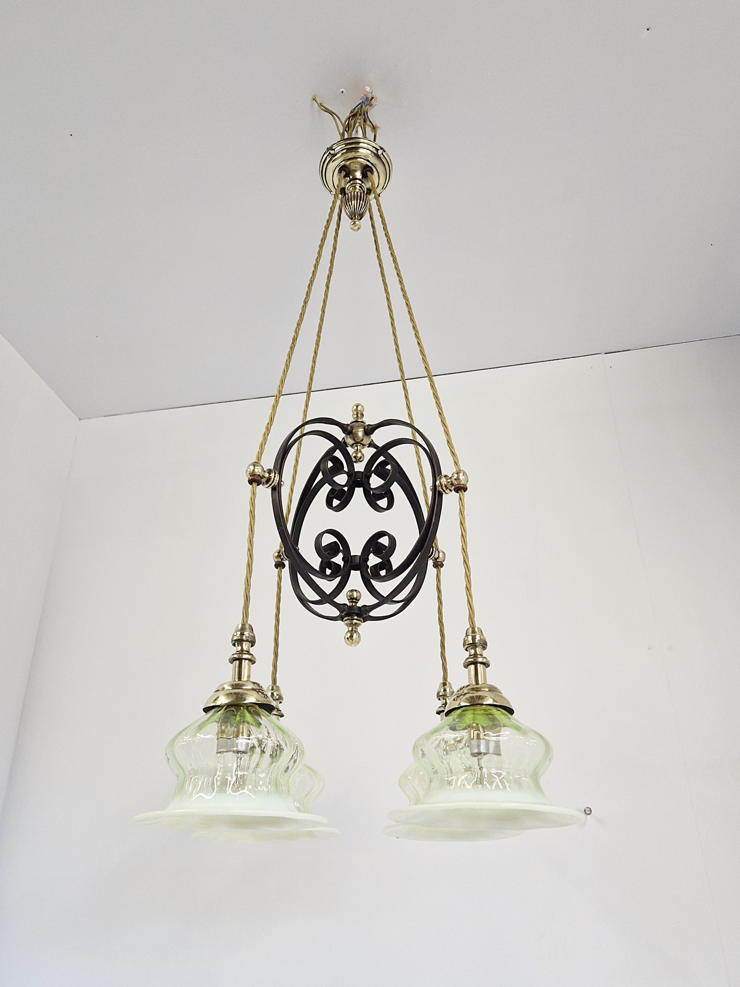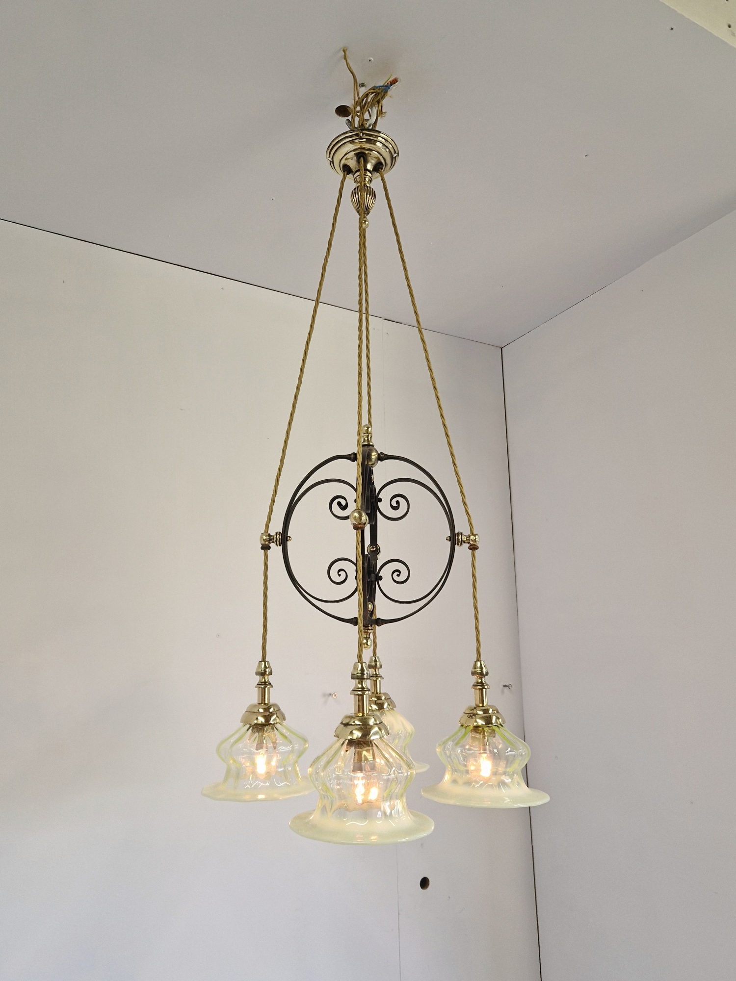 Product Code: LG688NS002A rare electrolier attributed to Harry Powell (James Powell & Sons) & Whitefriars’ resident blacksmith Mr Edminstone who was employed to produce wrought-iron light fittings on behalf of James Powell & Sons. The wrought-iron & brass arts & crafts electrolier now supports 4 sympathetic reproduction vaseline glass lampshades produced here in the UK by a specialist glass artisan using original techniques and methods.