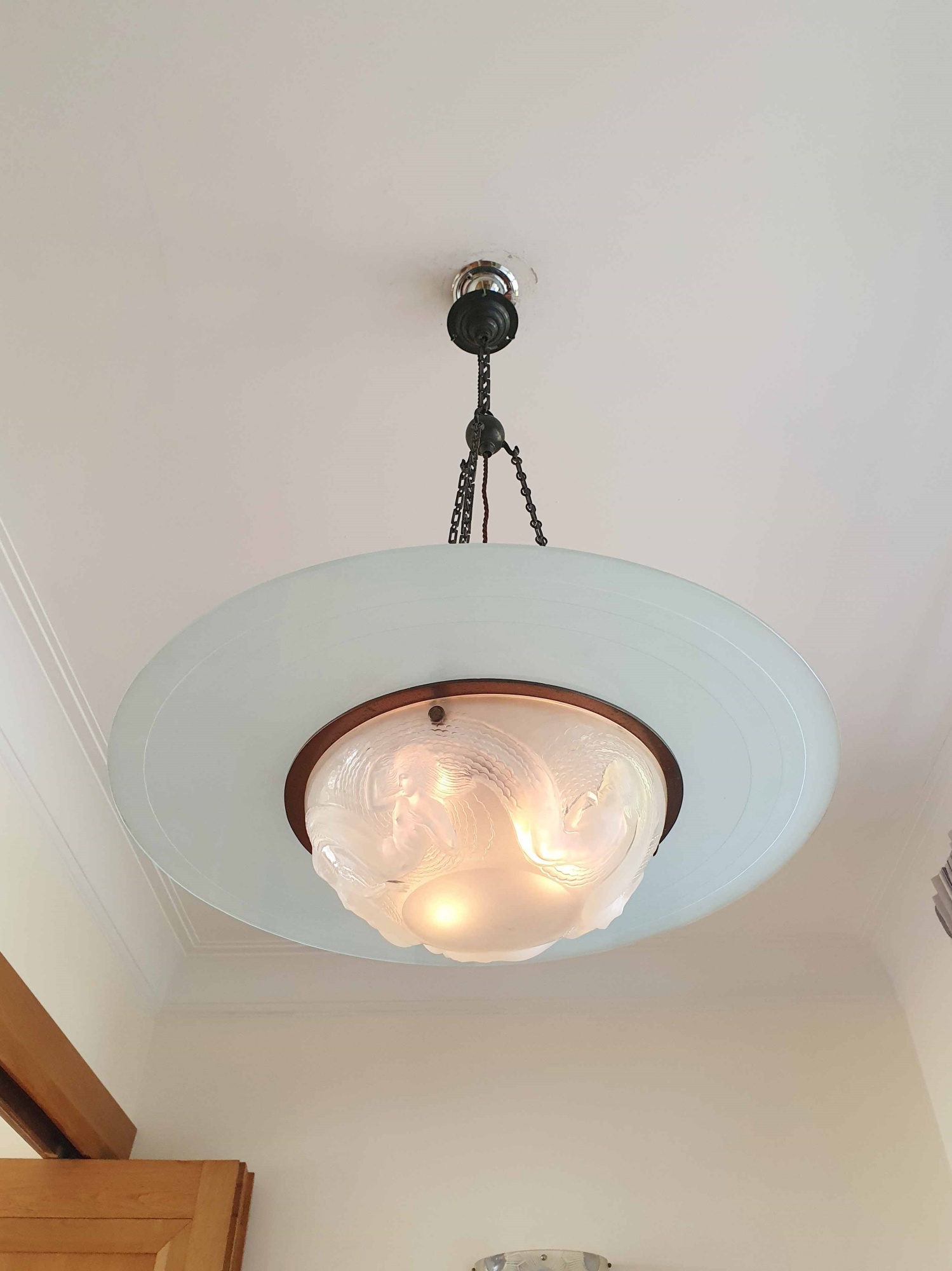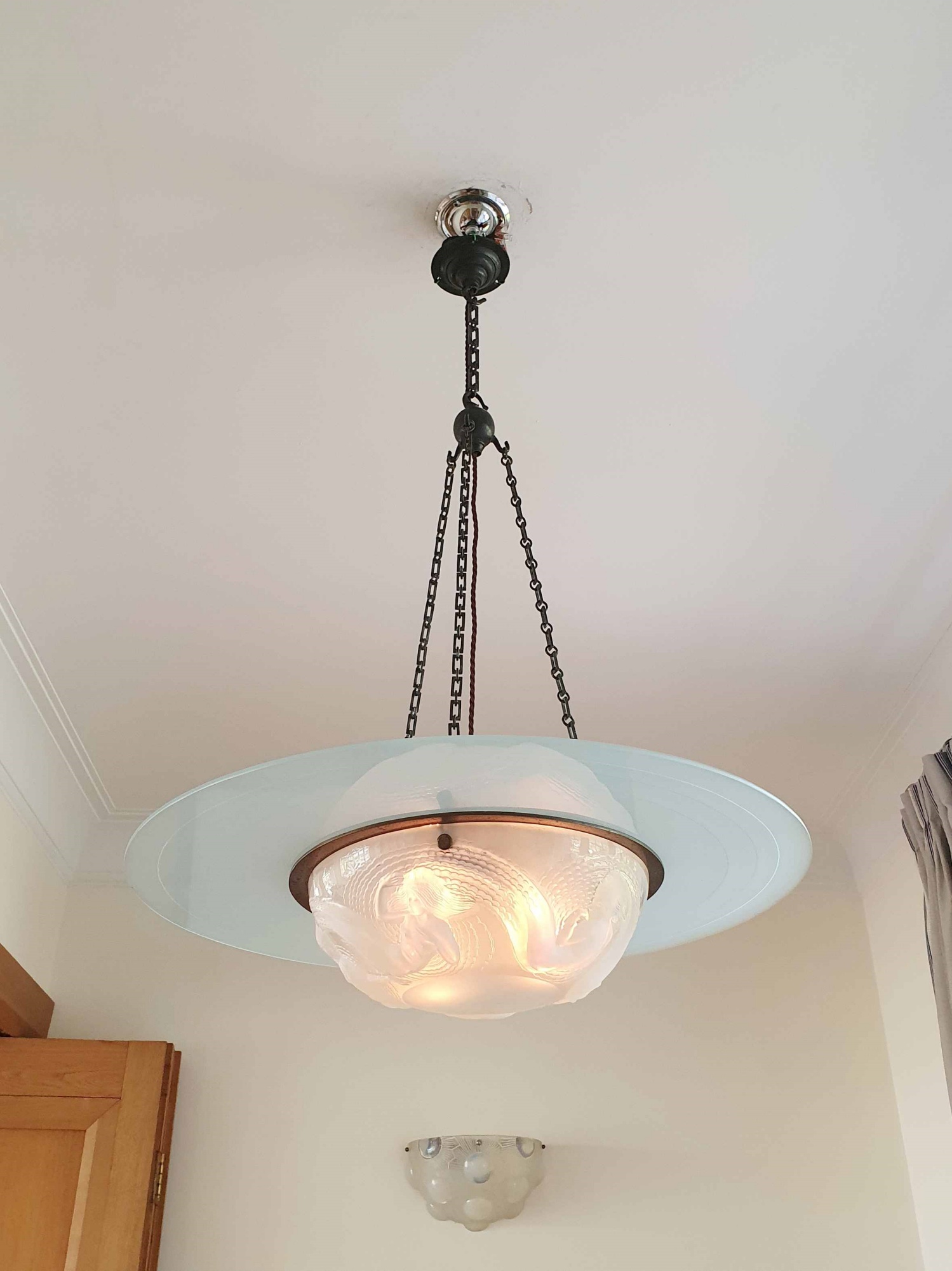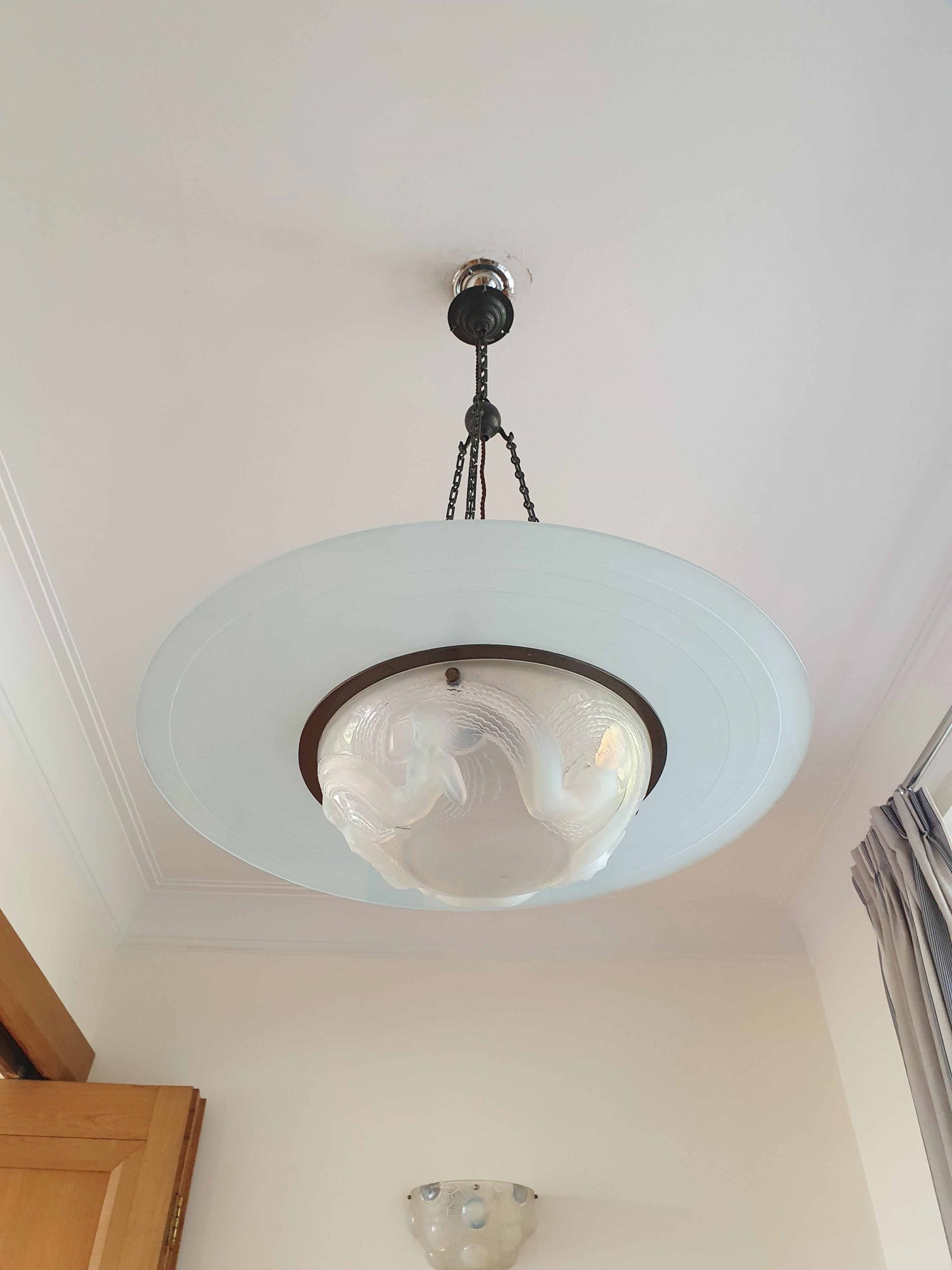 A superb signature opalescent glass chandelier by René Jules Lalique. The central plafonnier moulded with a design of five seductive sea nymphs and complimented with its original cut-glass “Saturn ring”, bronze chains and fitments or suspension. Wheel-engraved “R.Lalique, France”.