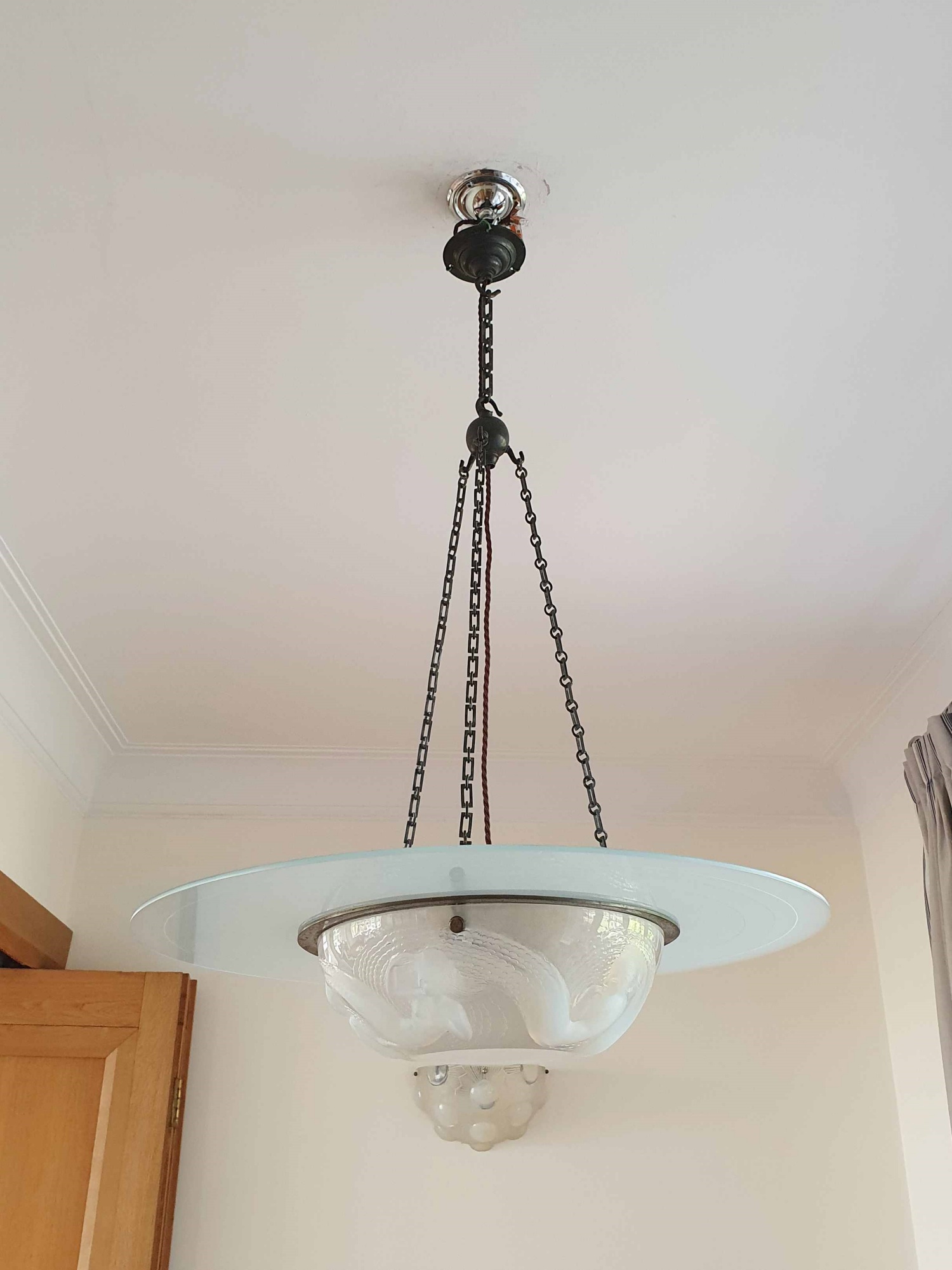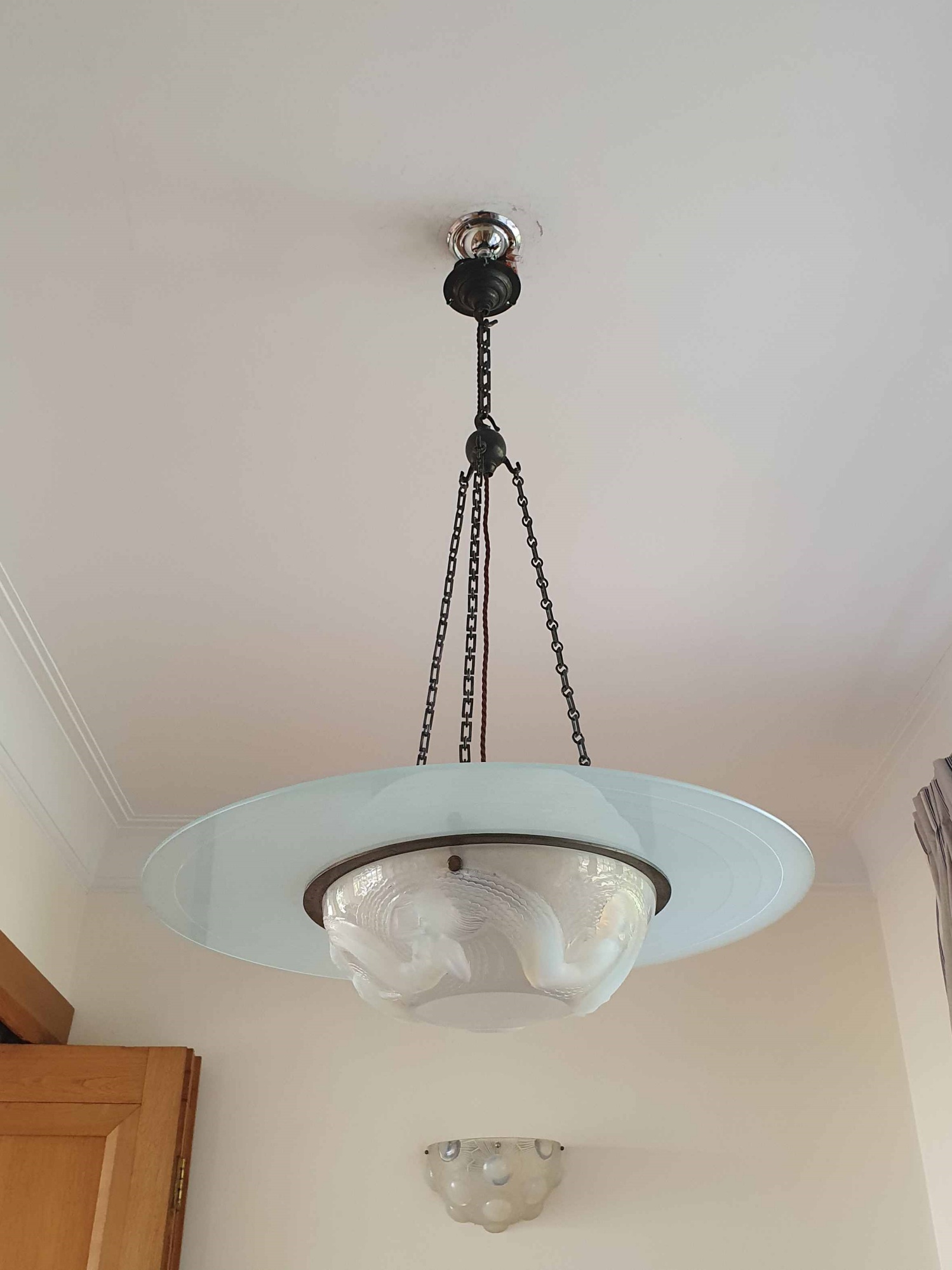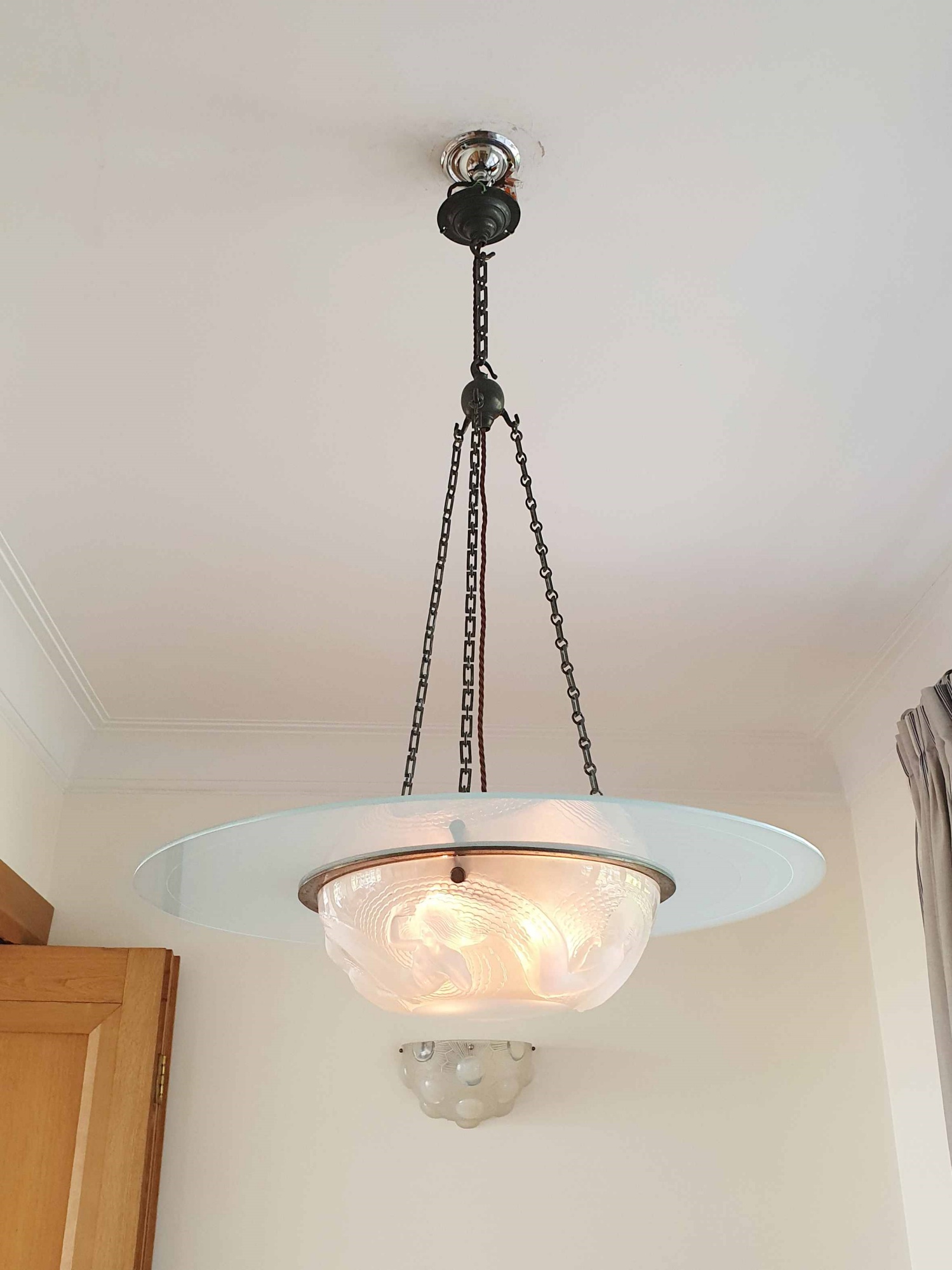 A superb signature opalescent glass chandelier by René Jules Lalique. The central plafonnier moulded with a design of five seductive sea nymphs and complimented with its original cut-glass “Saturn ring”, bronze chains and fitments or suspension. Wheel-engraved “R.Lalique, France”.