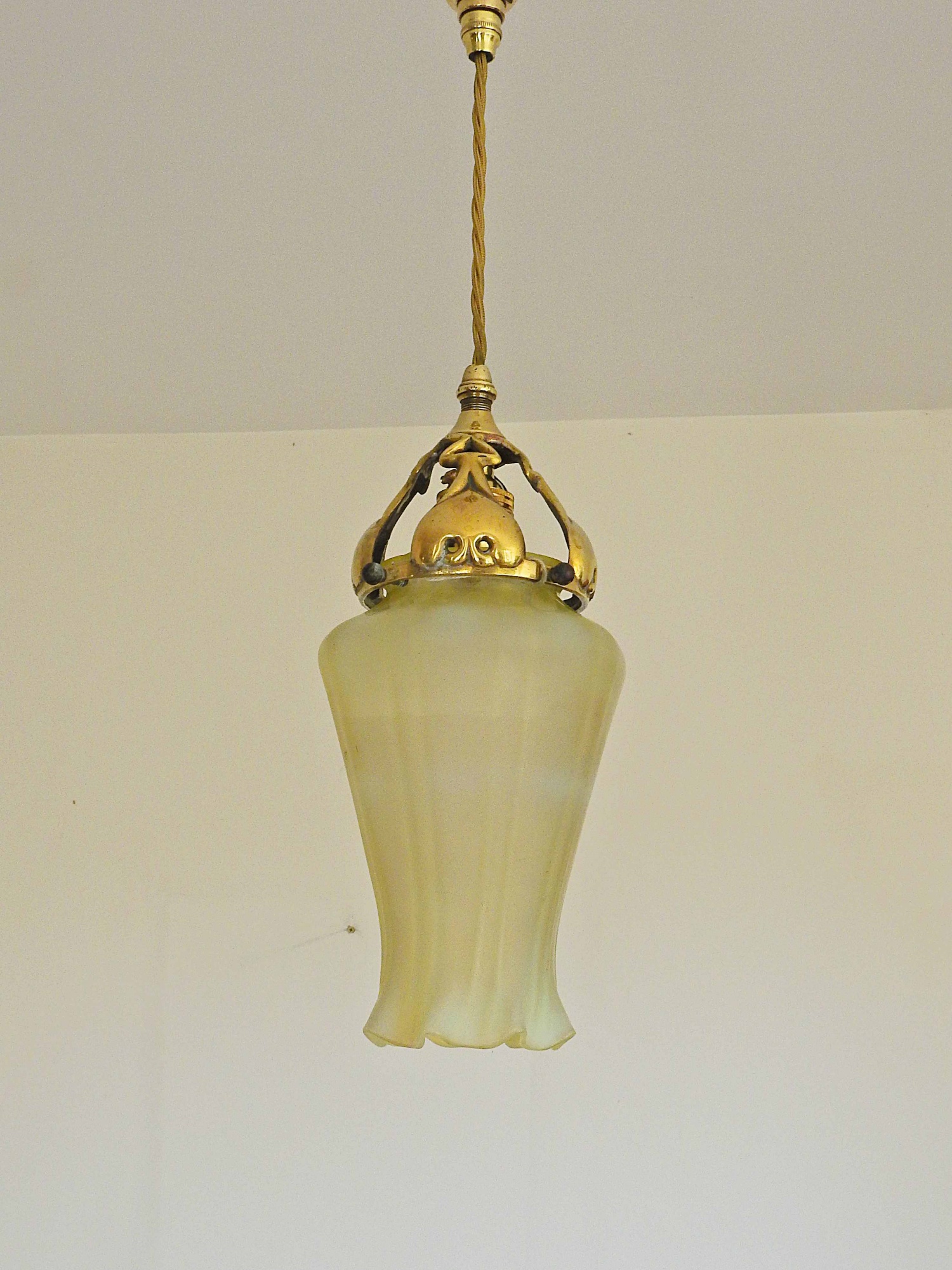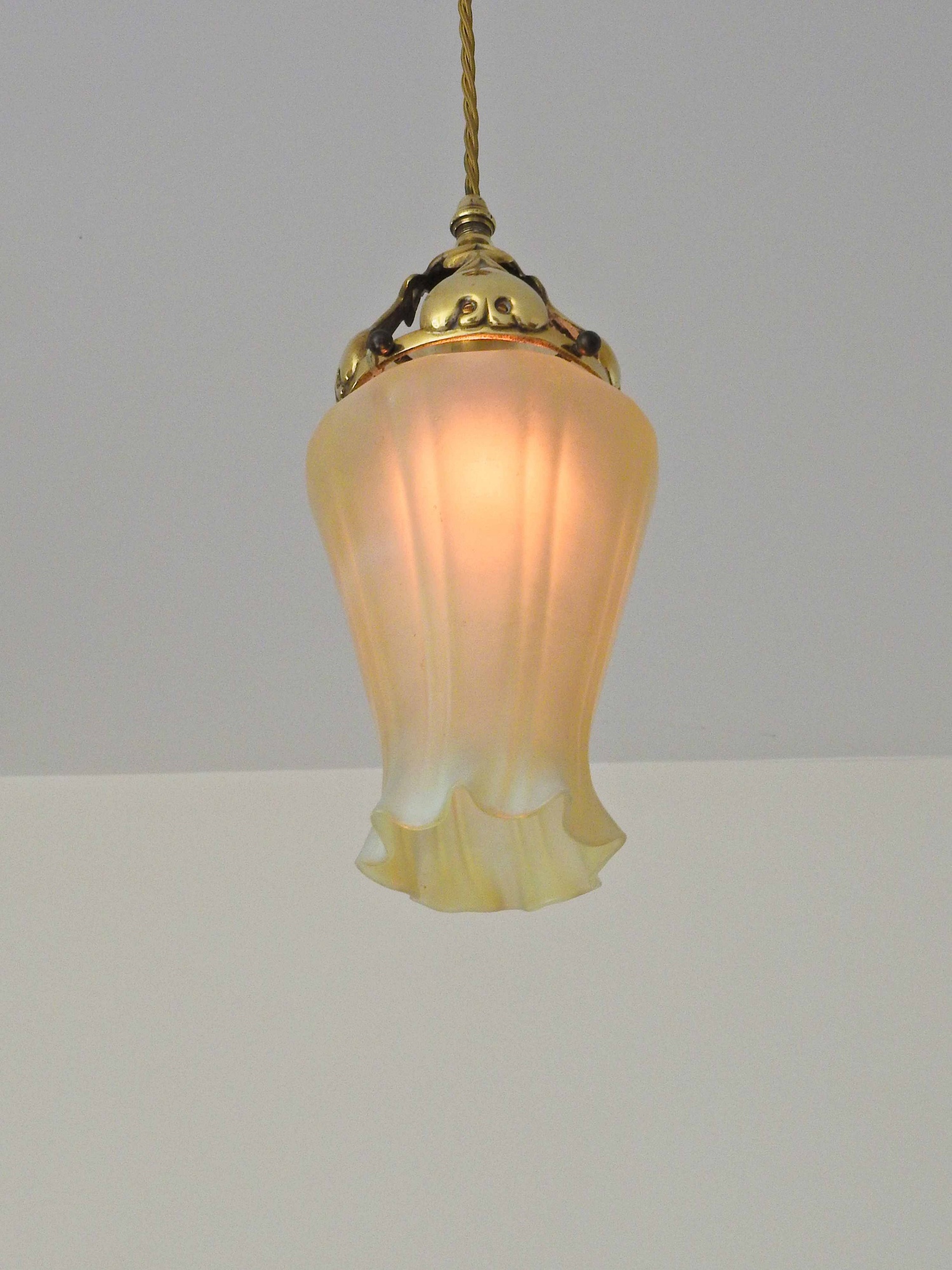 A very pretty vaseline glass lampshade of unusual tapering conical form and small frilled opening blown most probably at one of the Stourbridge glass factories, Birmingham with original art nouveau brass gallery. England, c.1900.