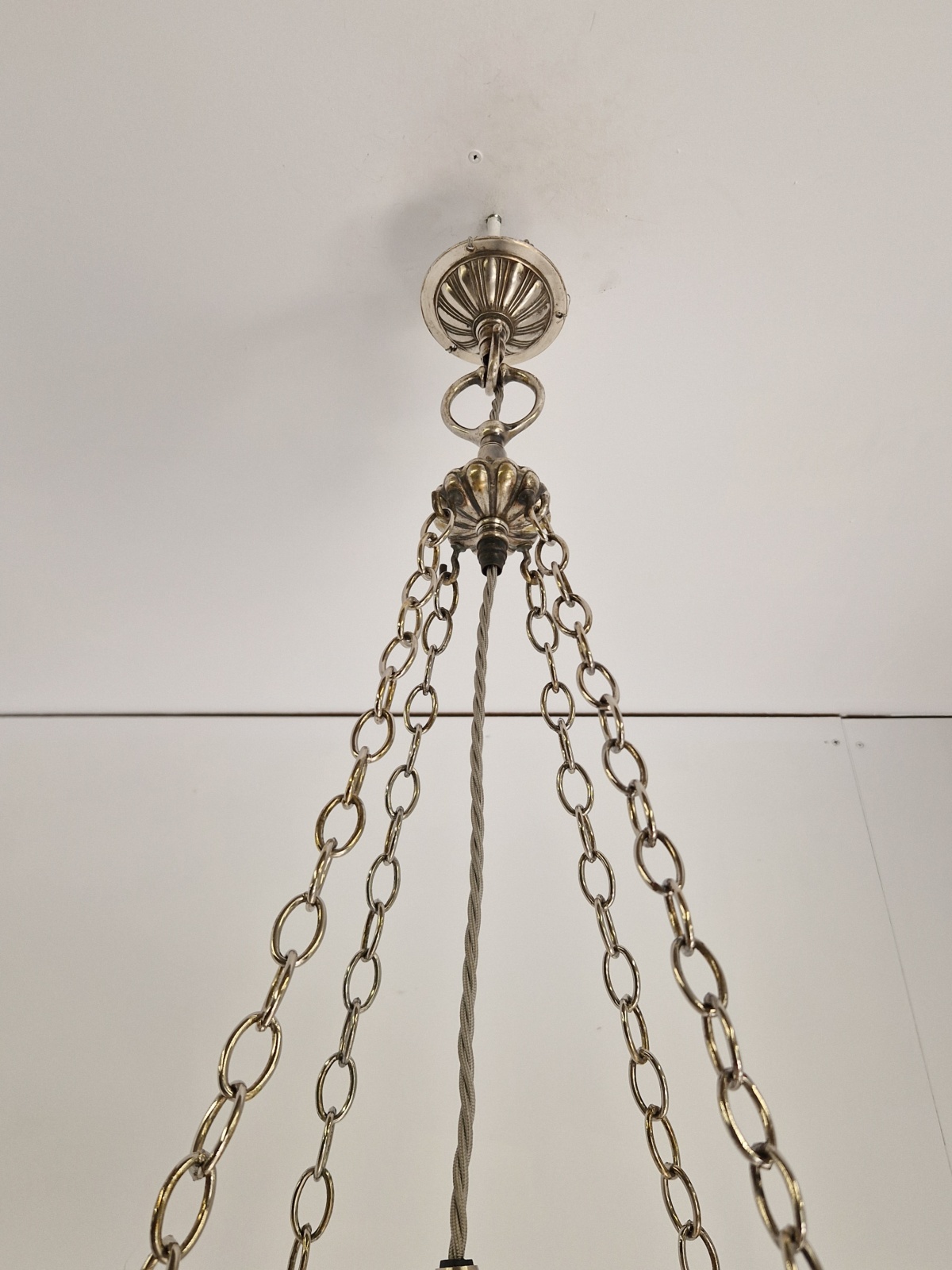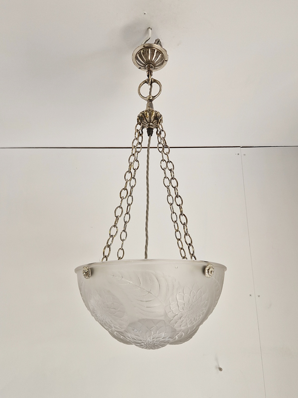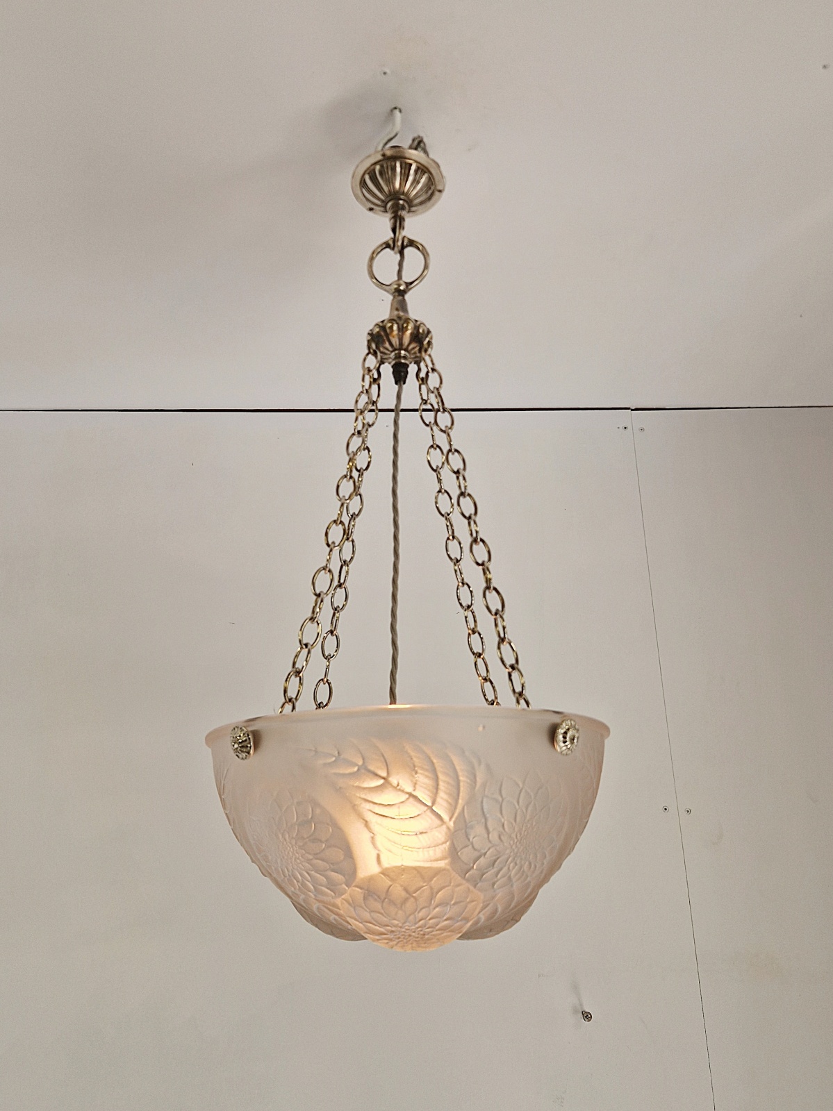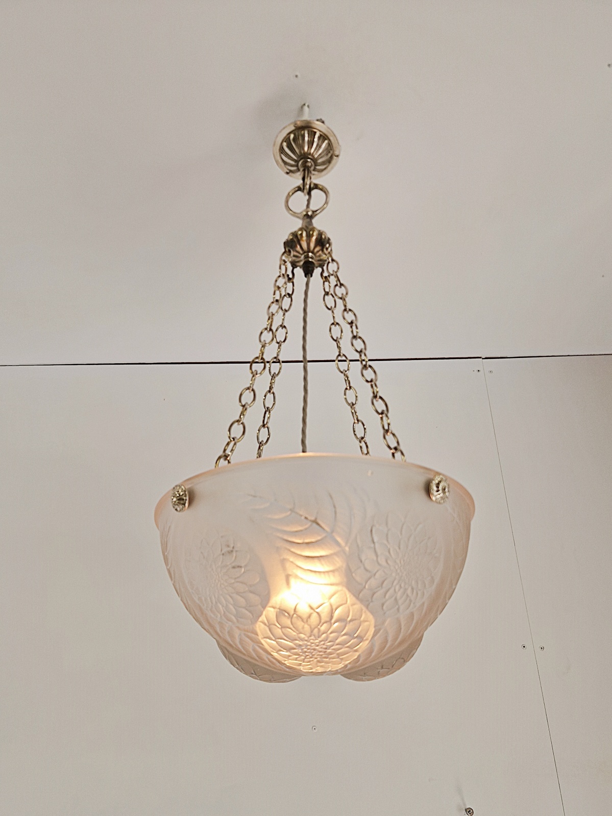 A pair of moulded, frosted and polished glass plafonniers of deep hemispherical form by René Lalique in the “dahlia” pattern. Each with very good quality silvered on cast brass fitments for suspension. Both Plafonniers signed “R.Lalique” France c.1930