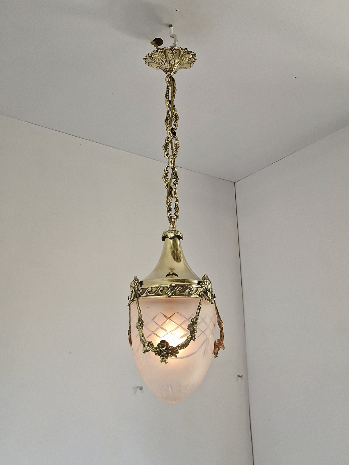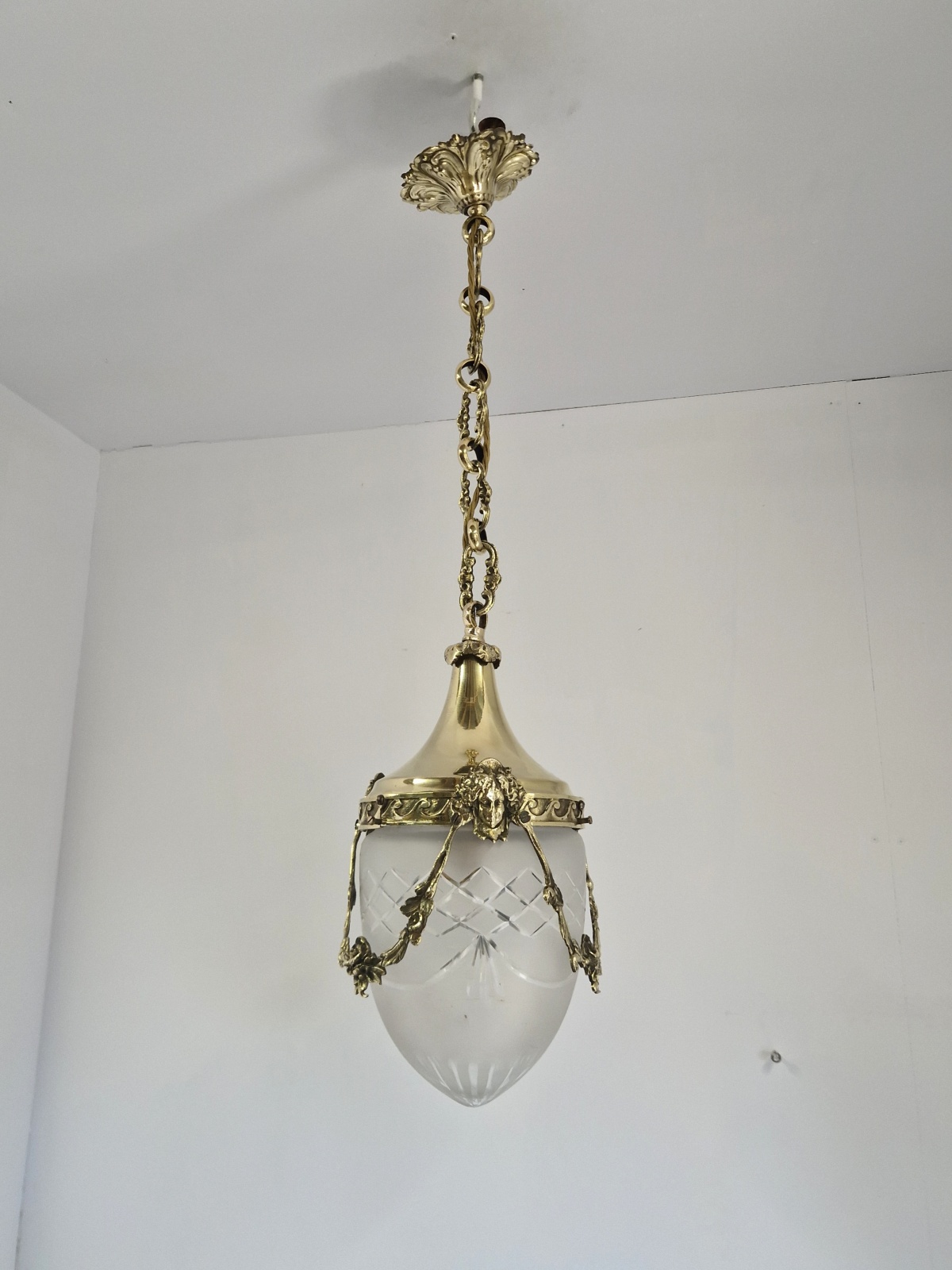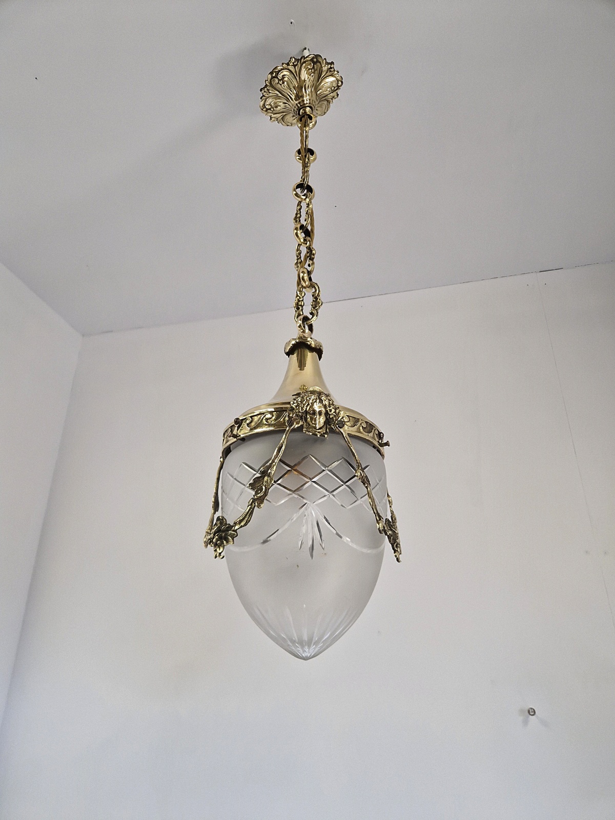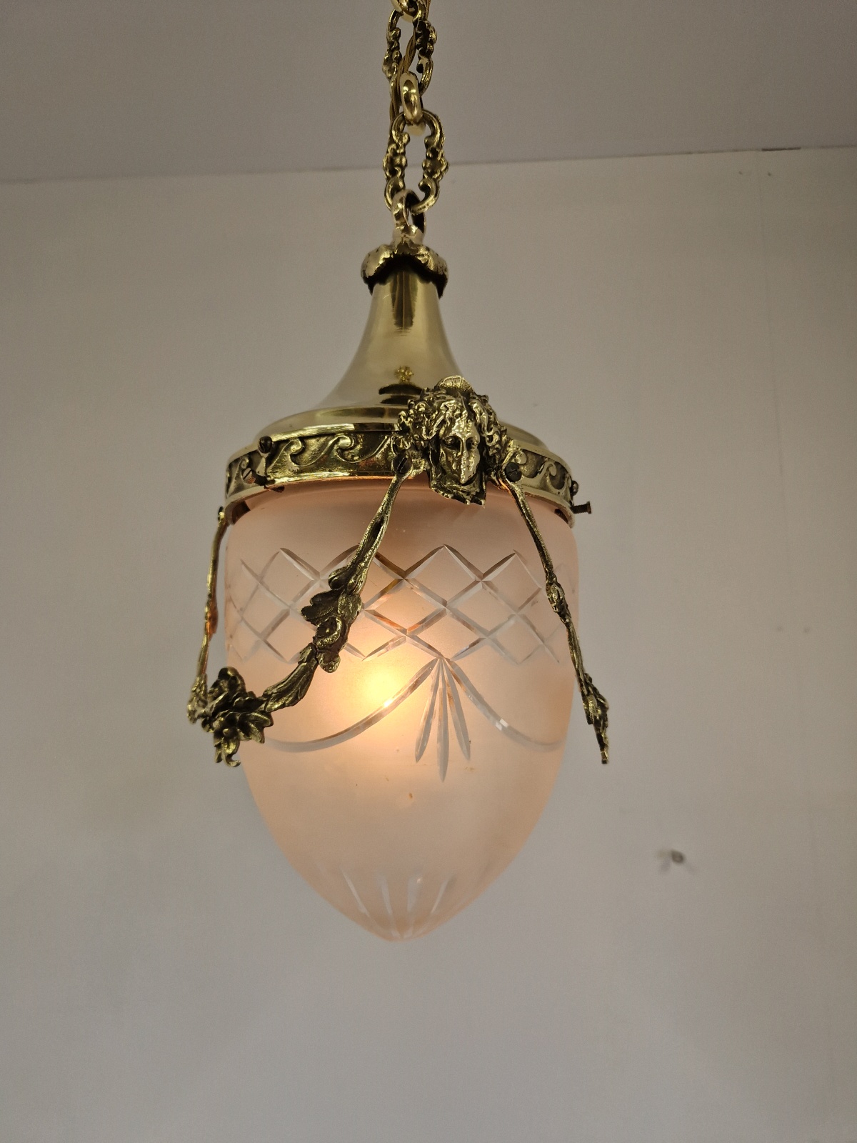 Product Code: JAL1264A Versailles lantern in the style of Fonderies de Bronze, Nanterre & Lyon. The cut-glass satin globe shades encased in decorative neo-classical brass frameworks with Femme Fleur Heads. The lantern maintains the period chain and ceiling rose to complement. England or France c.1910