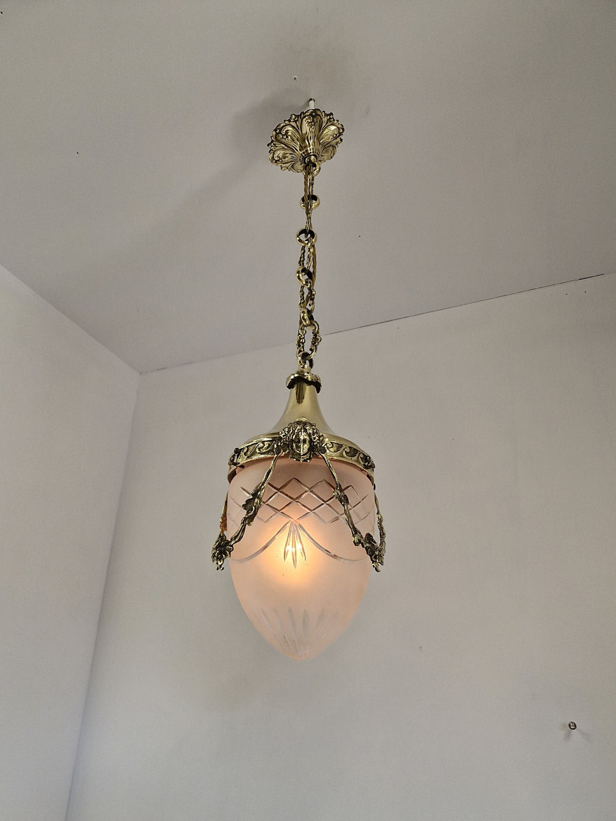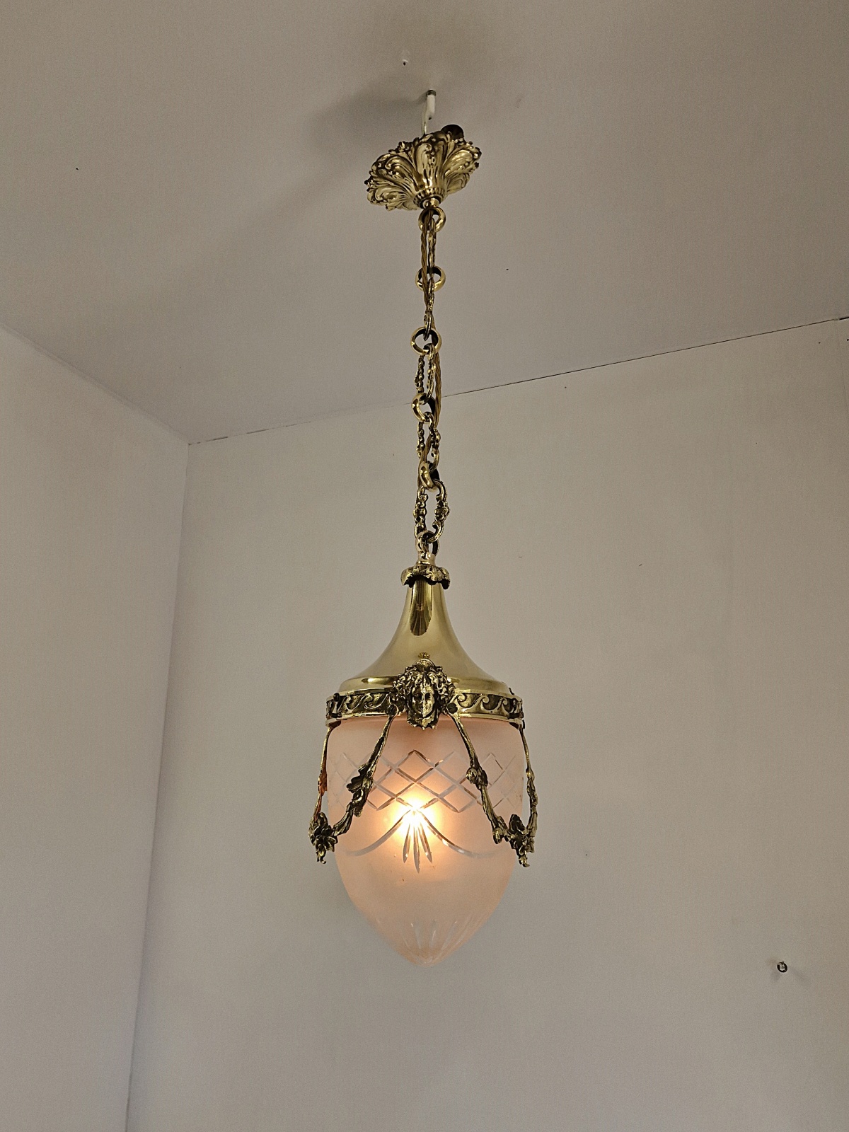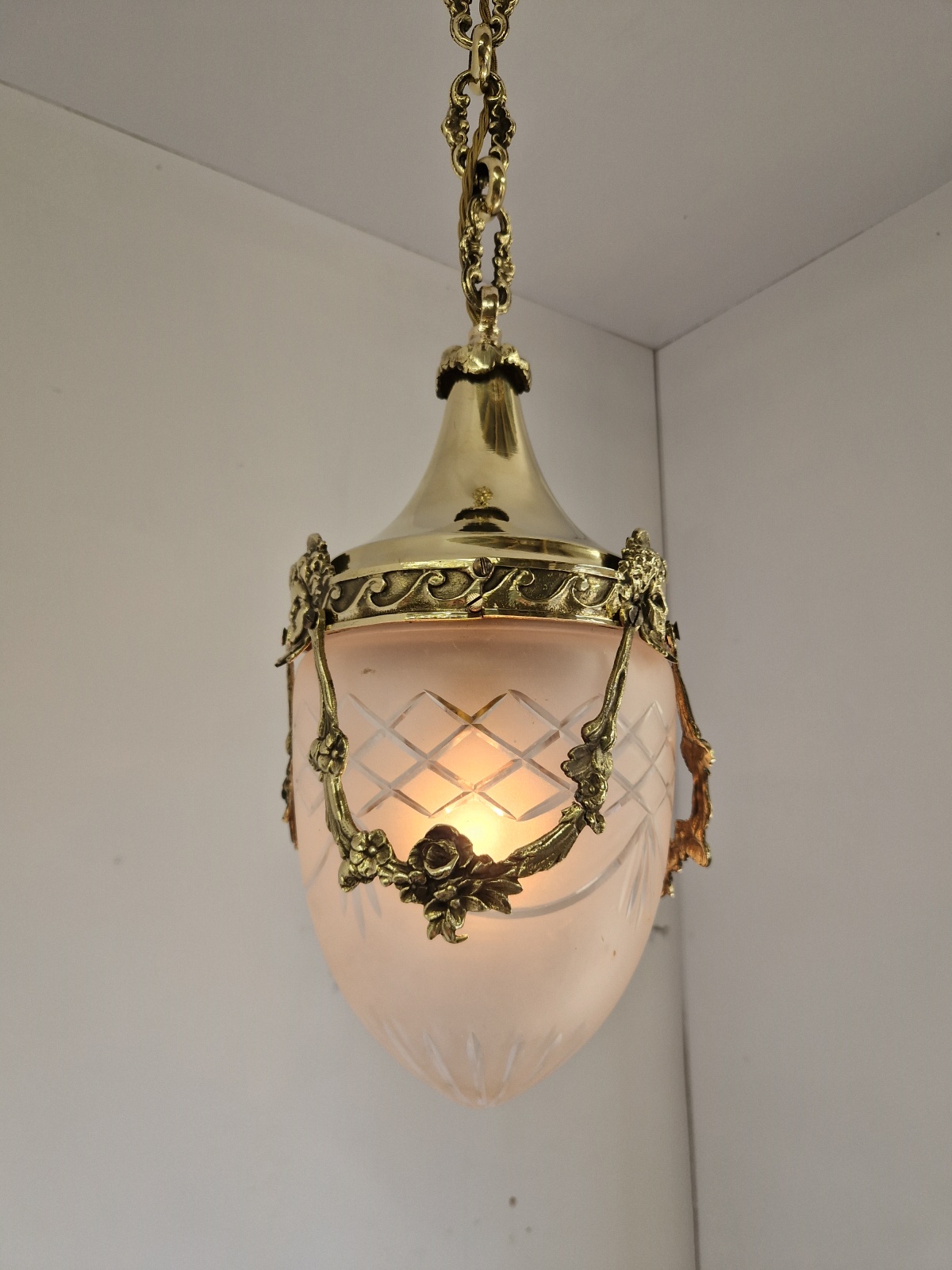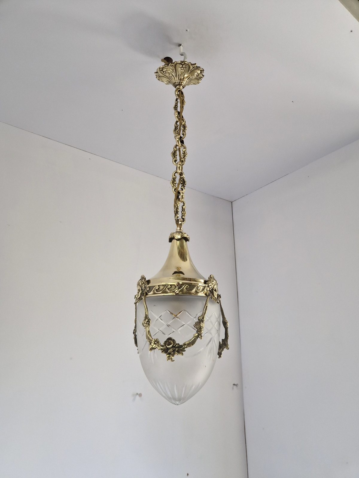 Product Code: JAL1264A Versailles lantern in the style of Fonderies de Bronze, Nanterre & Lyon. The cut-glass satin globe shades encased in decorative neo-classical brass frameworks with Femme Fleur Heads. The lantern maintains the period chain and ceiling rose to complement. England or France c.1910