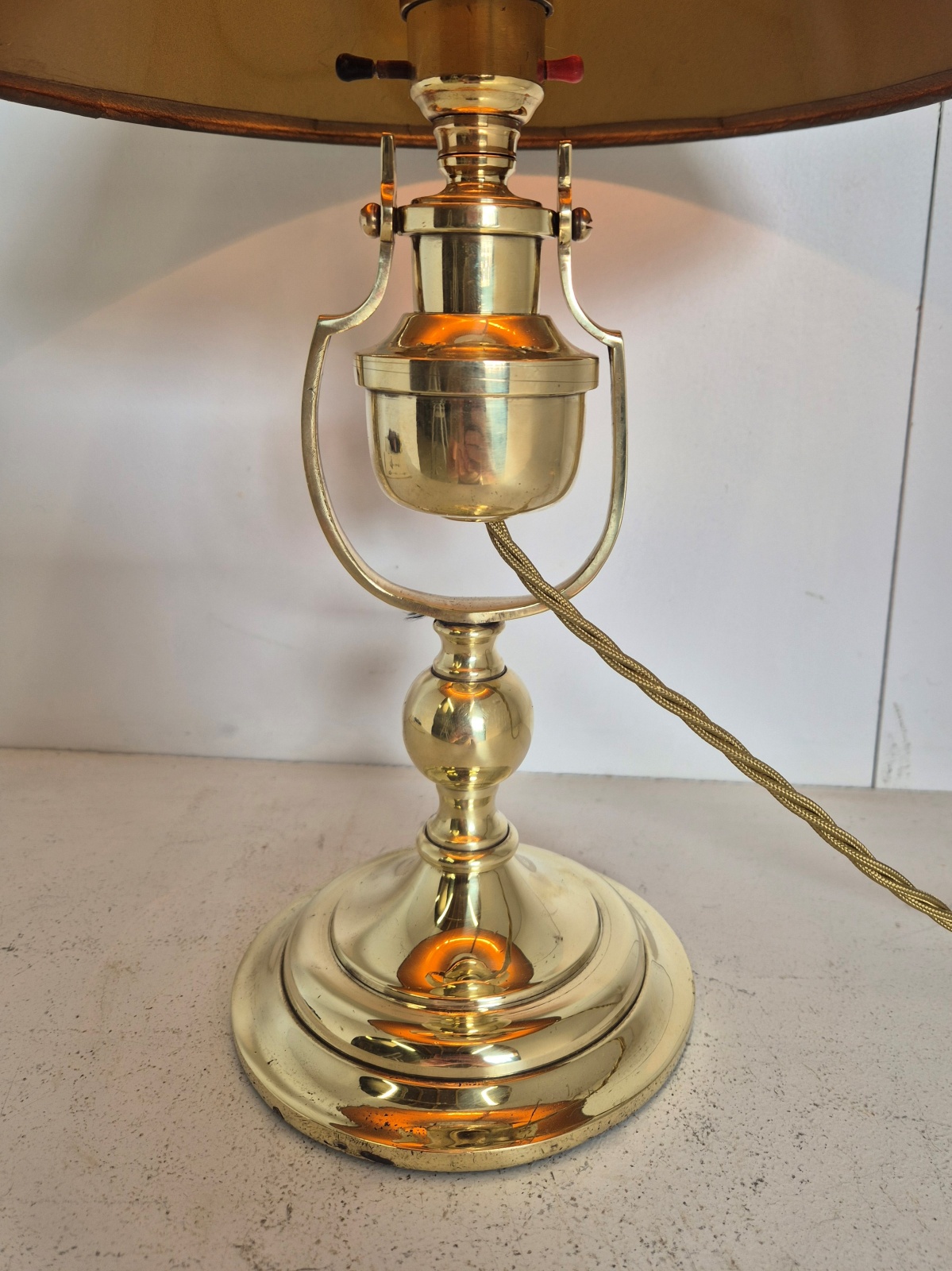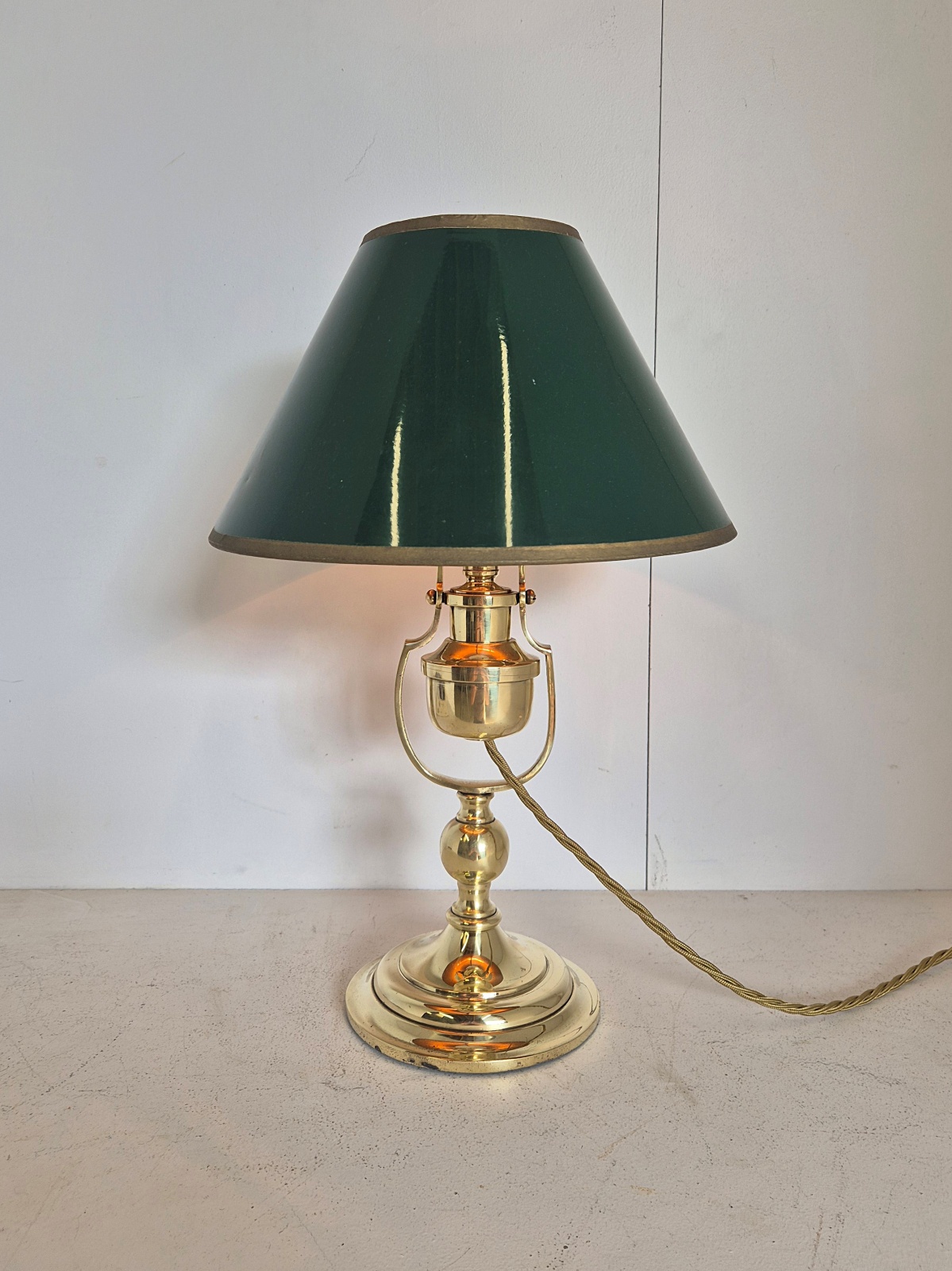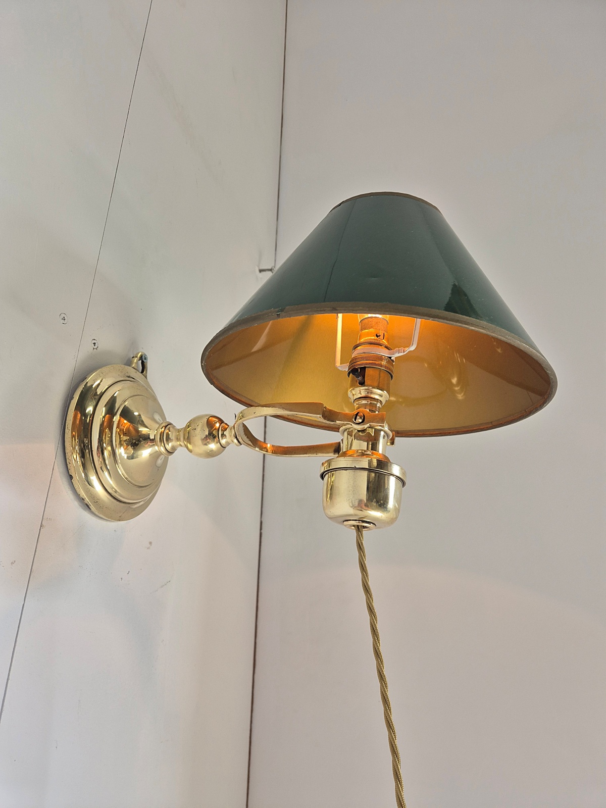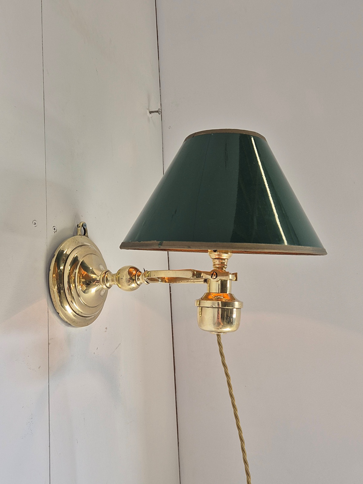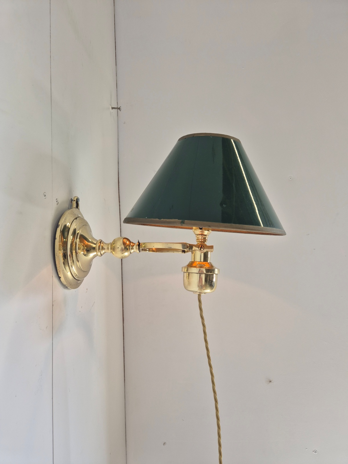 A brass “gimbal” lamp displayed here as a wall light but can also be used as a table lamp. Designed by The General Electric Company but apparently unsigned. The base supporting a green lampshade for display only (not included). England c1922