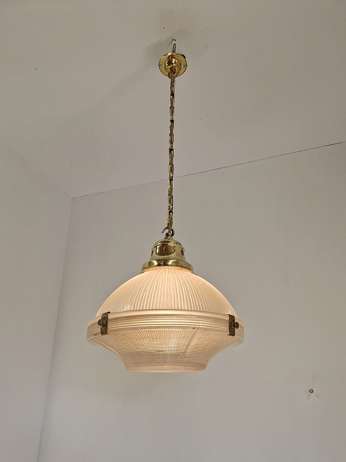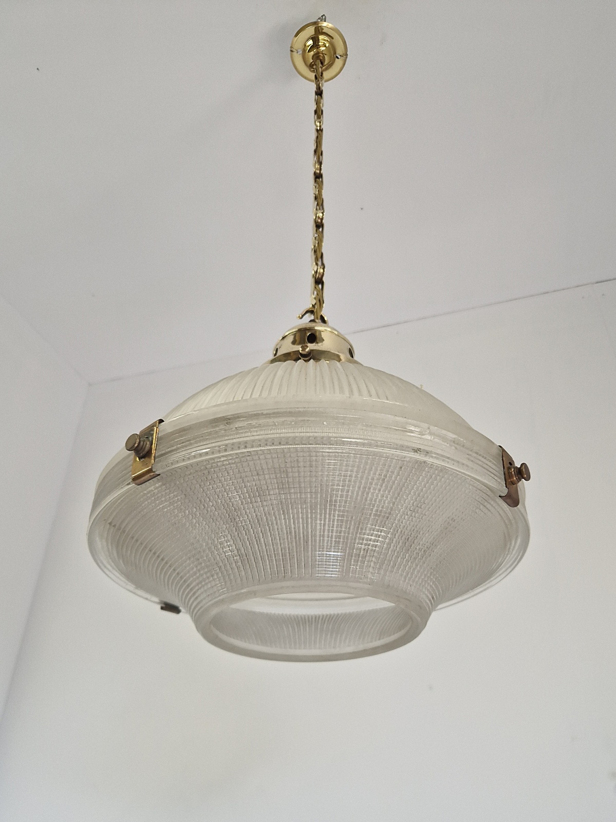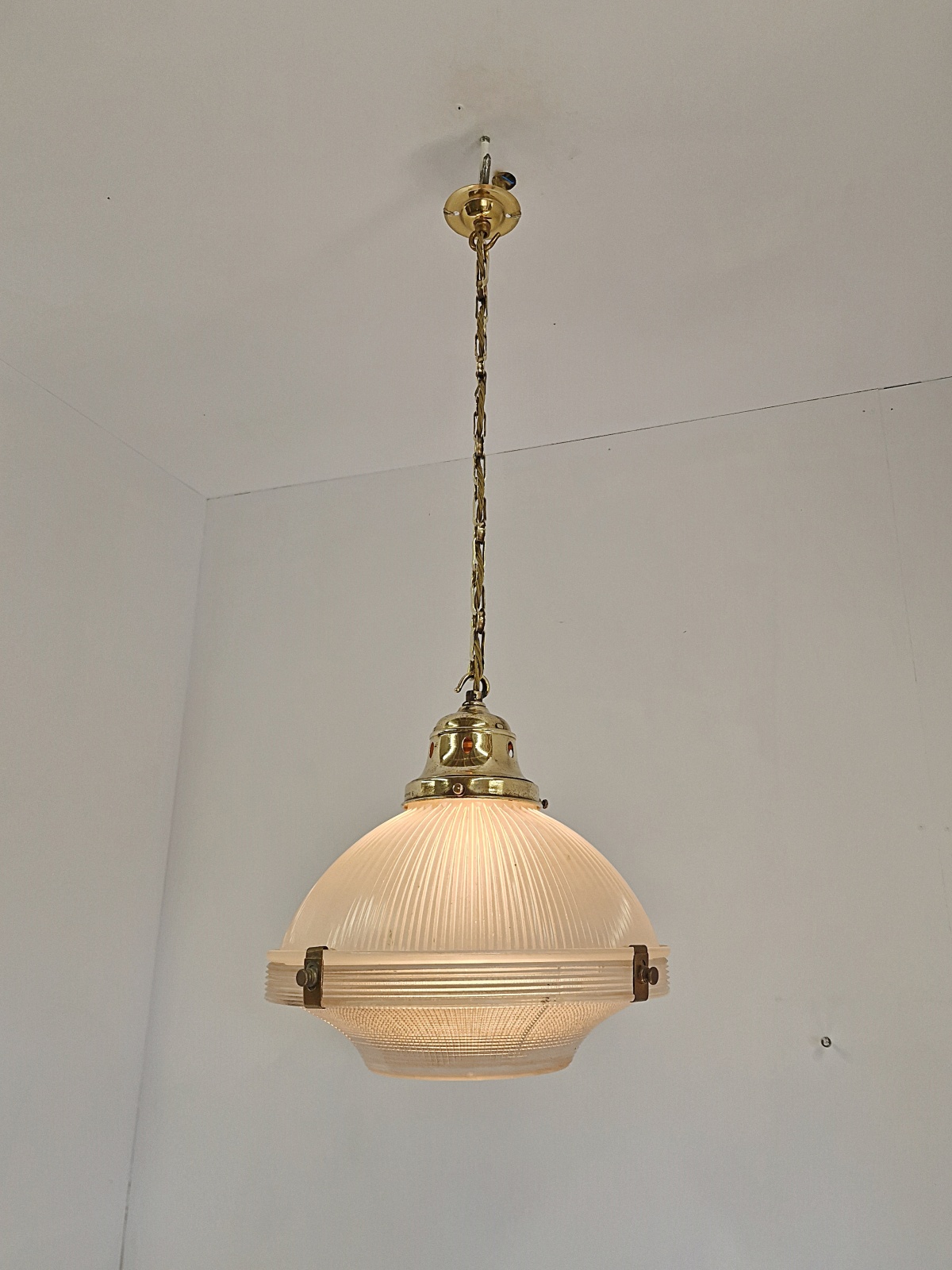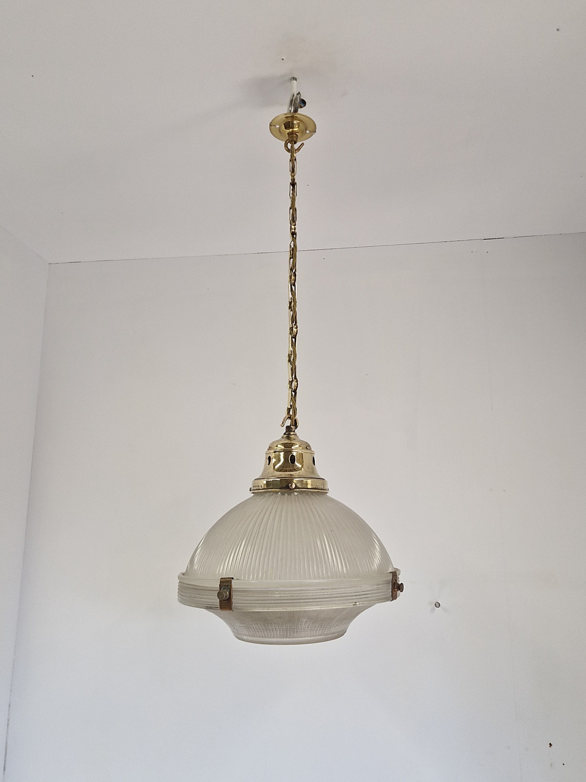 Product Code: LG7202 large Holophane Company satellite lanterns made in their distinctive “Blondel” & “Stiletto” prism glass. The glass and original galleries all signed Holophane with original period chain and replacement ceiling hook for suspension. England c.1900