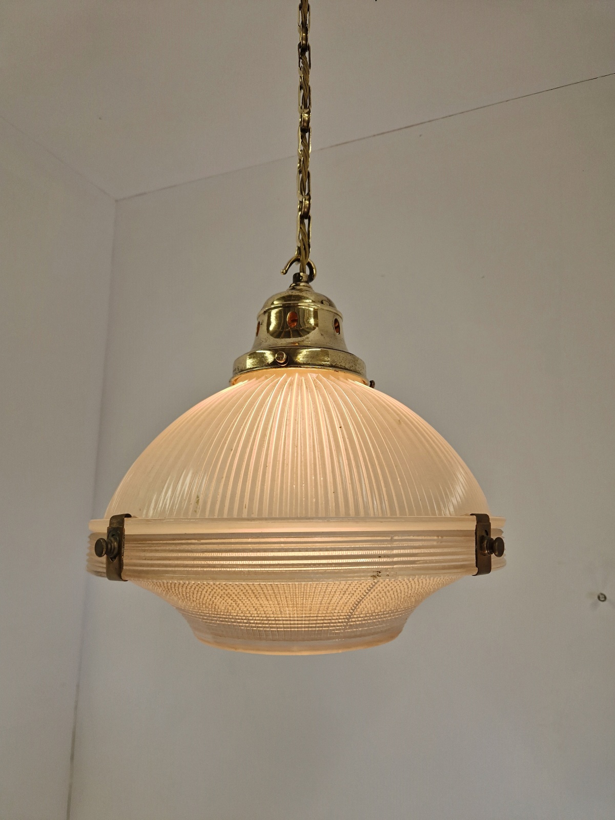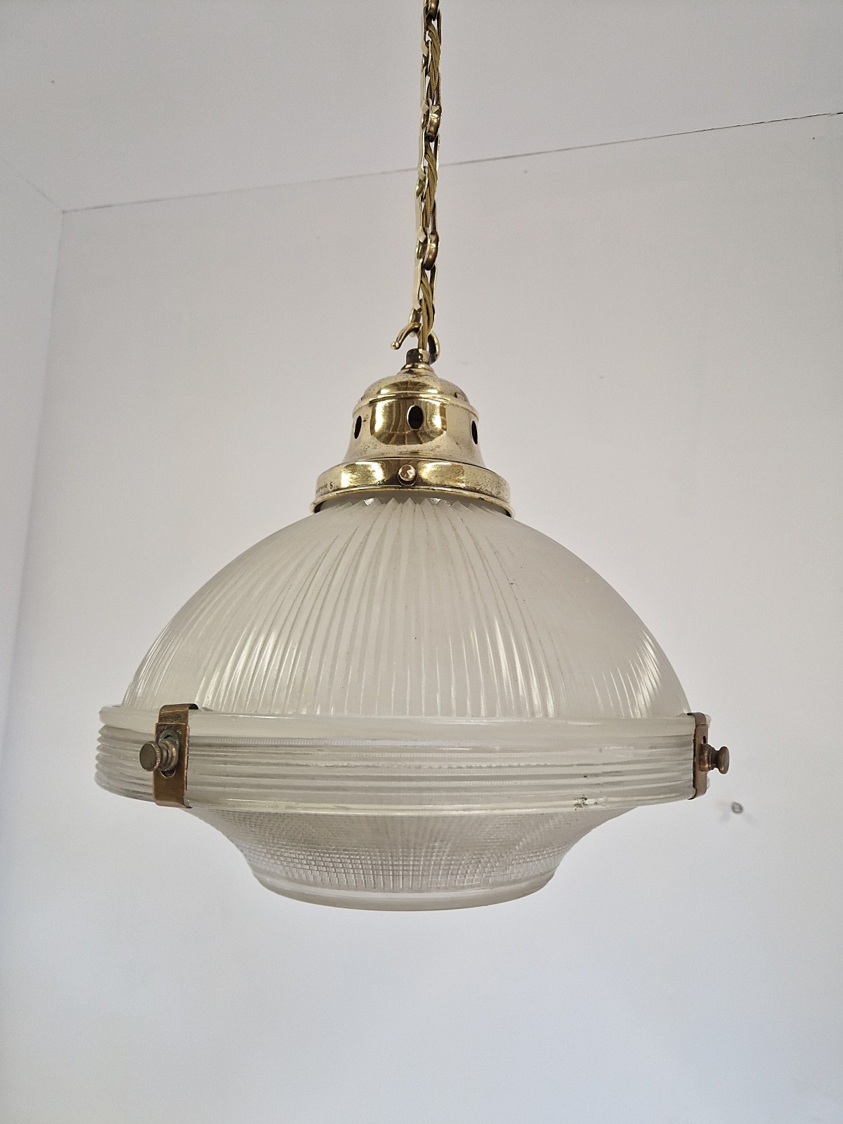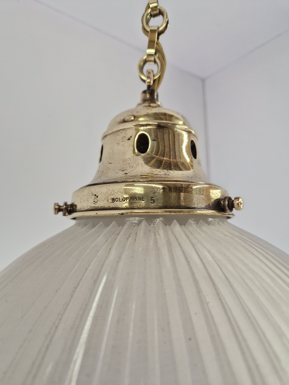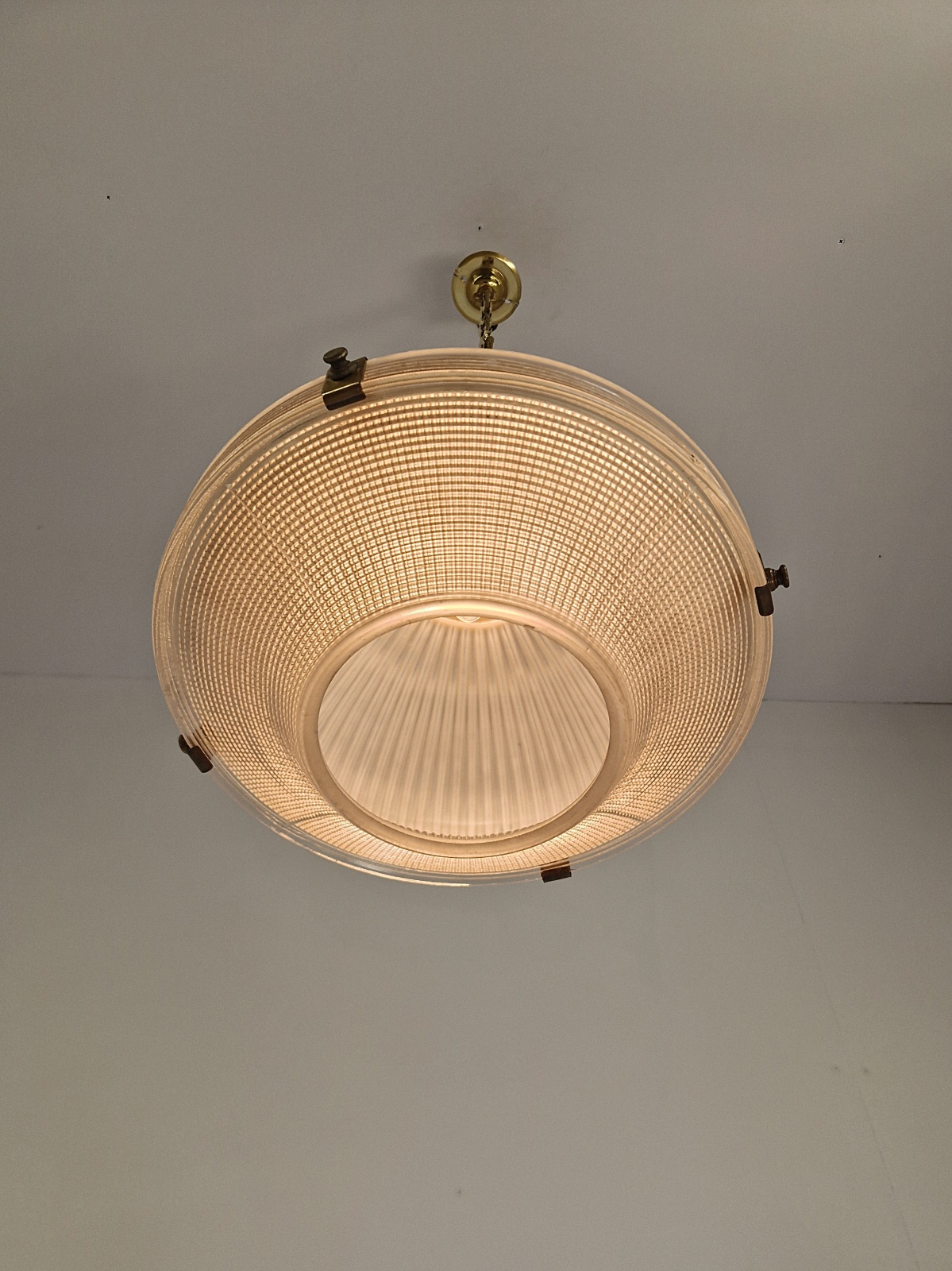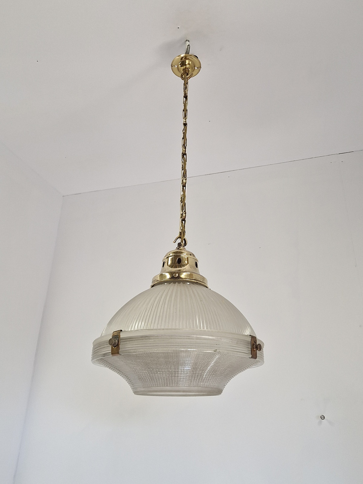 Product Code: LG7202 large Holophane Company satellite lanterns made in their distinctive “Blondel” & “Stiletto” prism glass. The glass and original galleries all signed Holophane with original period chain and replacement ceiling hook for suspension. England c.1900