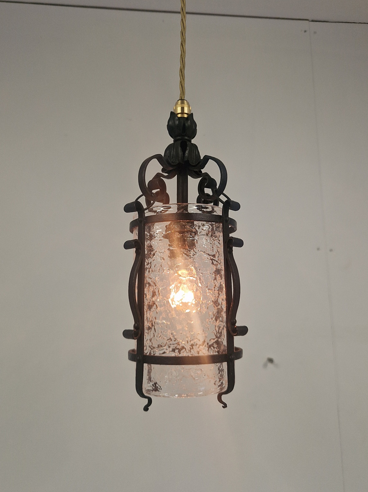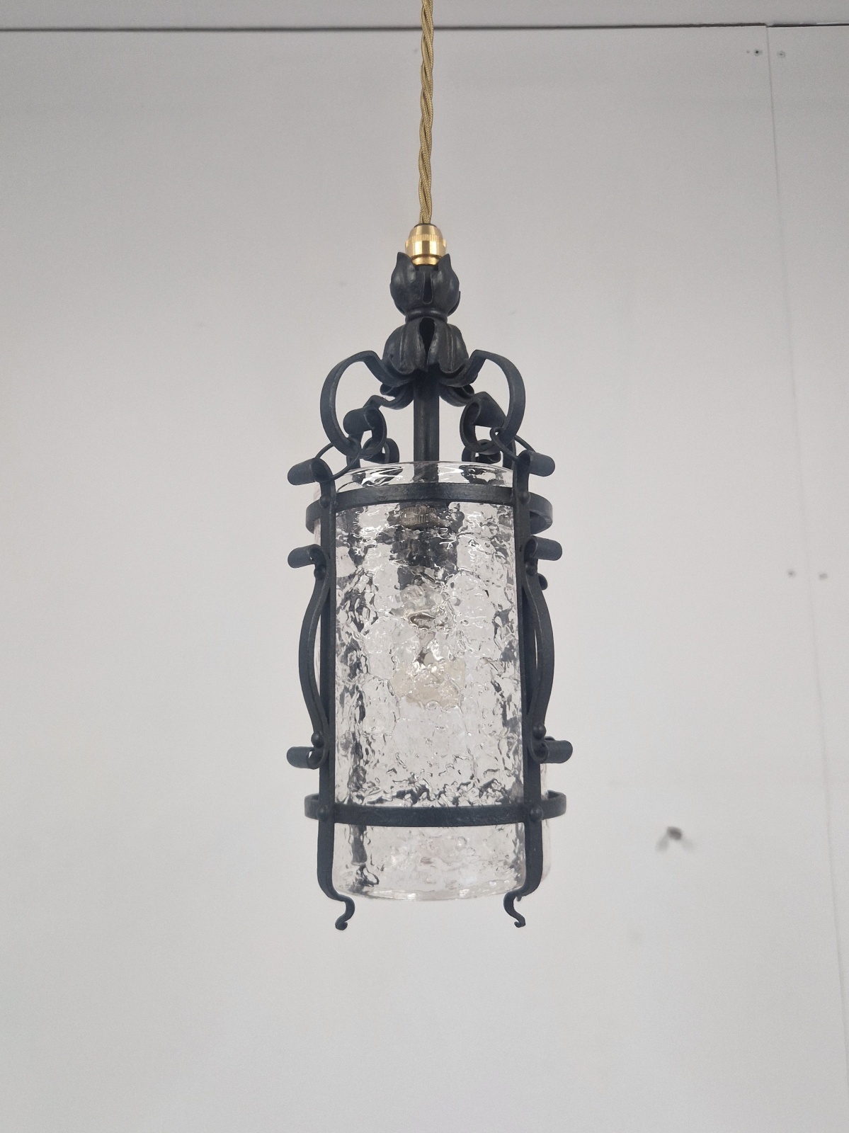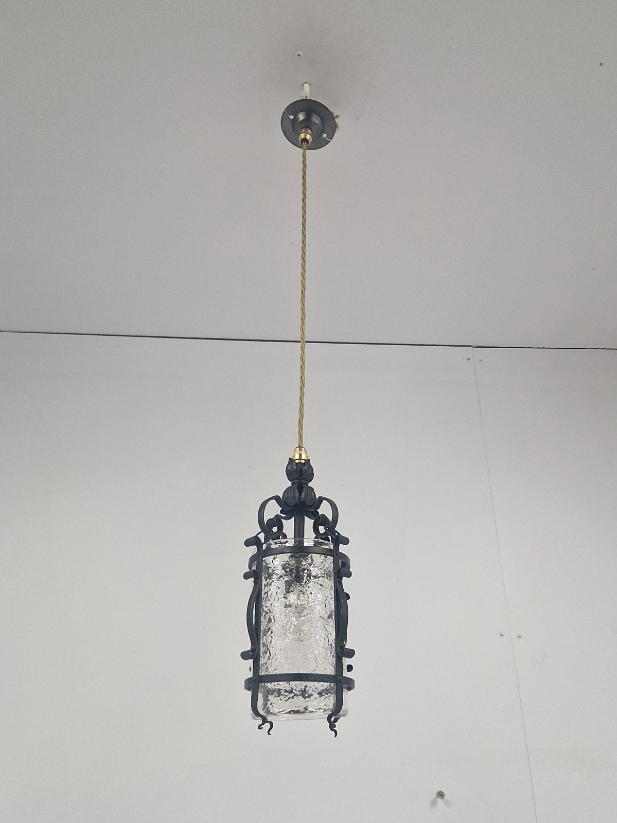 Product Code: JAL1225A pair of classic small wrought-iron arts and crafts porch or hall lanterns with their original crackle-ware glass insert. England c.1900