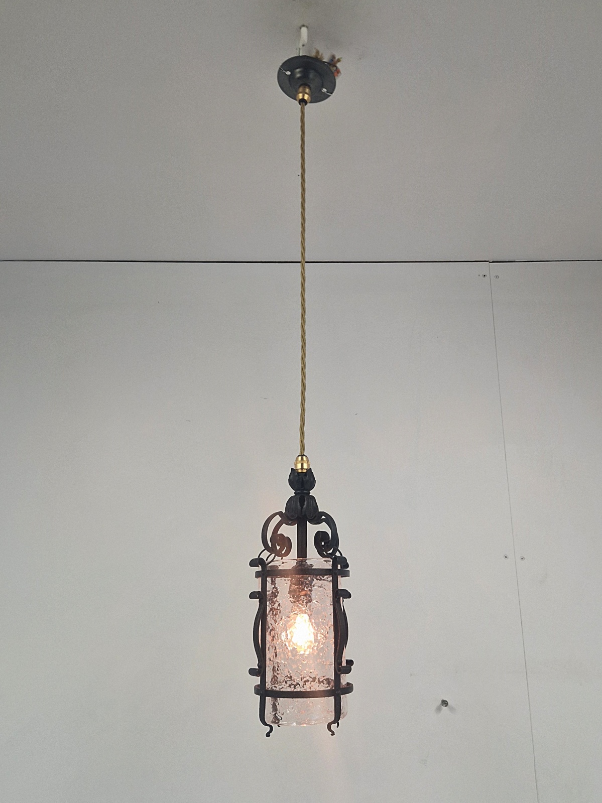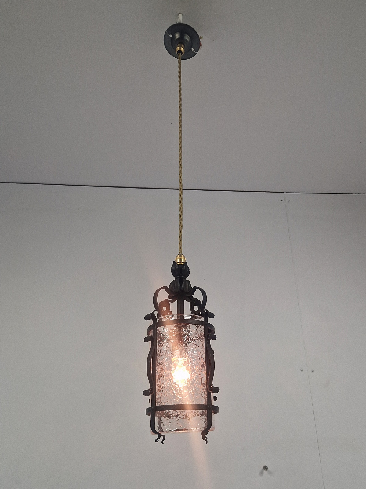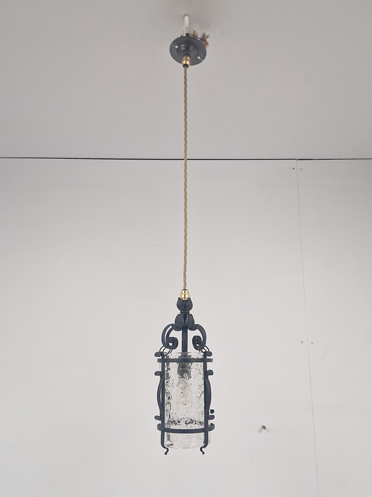 Product Code: JAL1225A pair of classic small wrought-iron arts and crafts porch or hall lanterns with their original crackle-ware glass insert. England c.1900