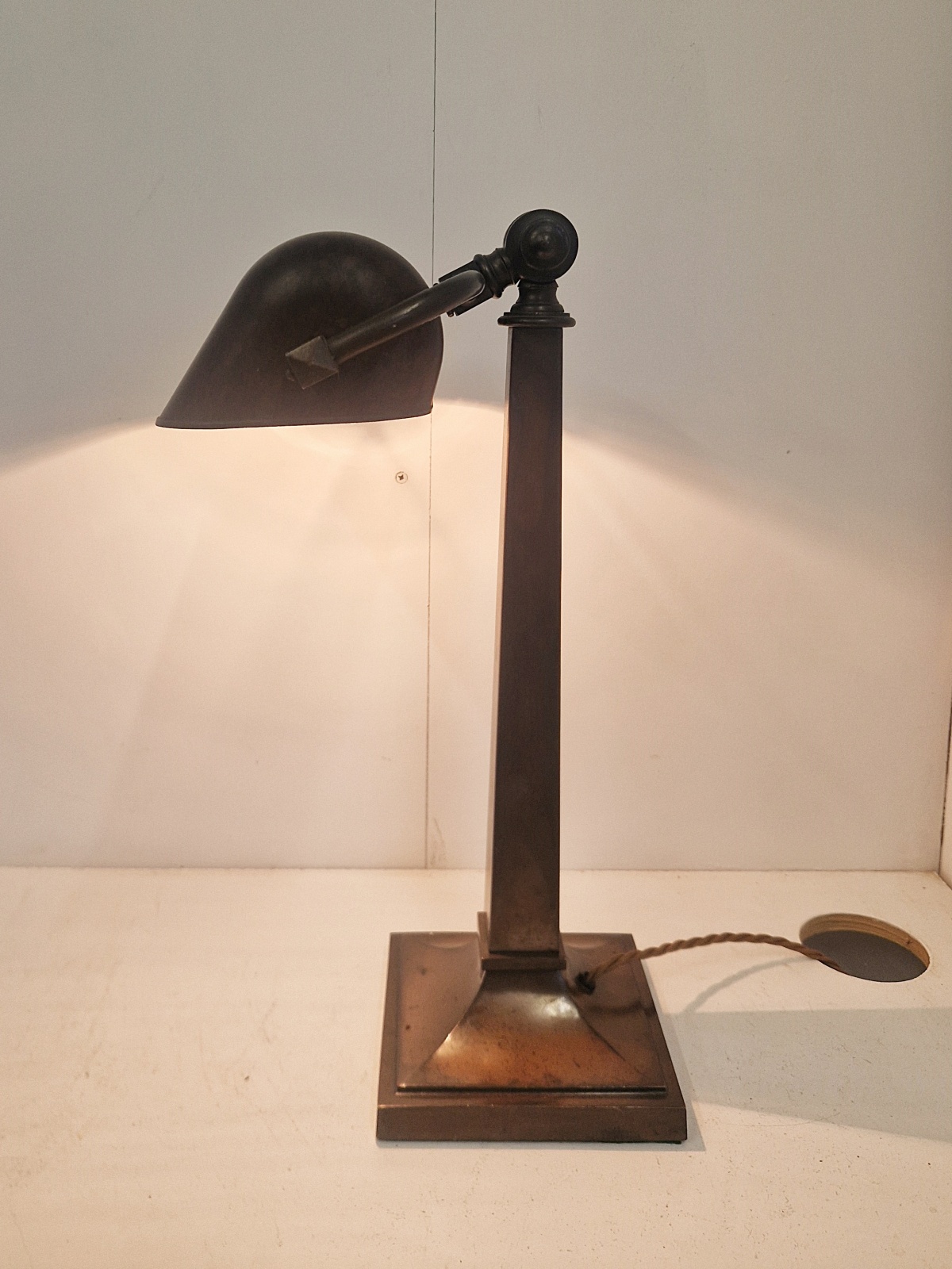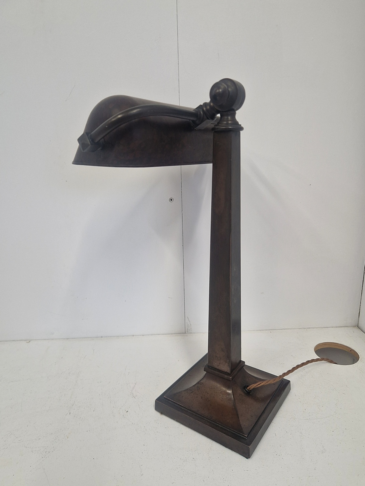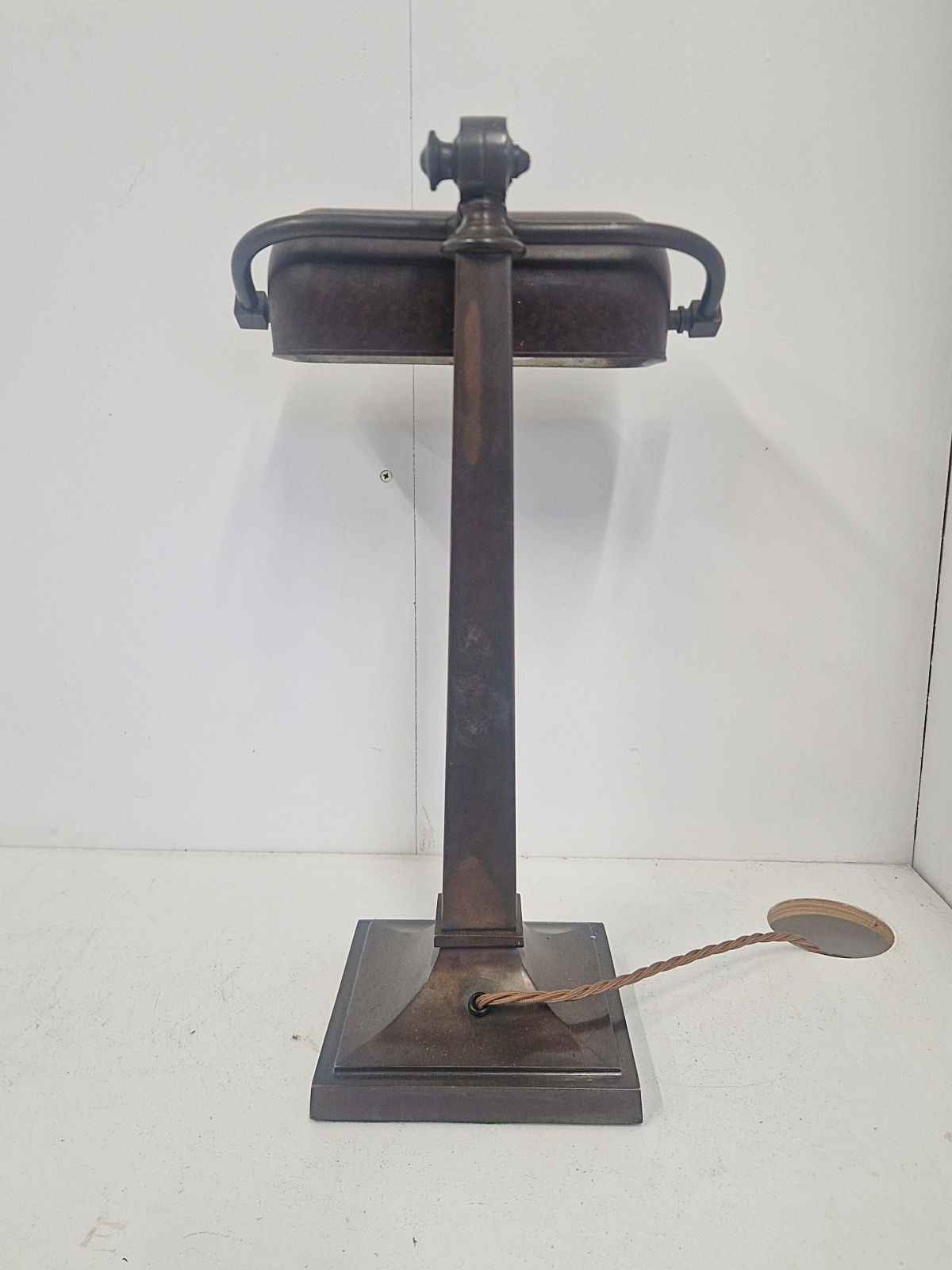 Product Code: LG769A fabulous quality and rare multi-adjustable “Banker’s” desk lamp. The large lamp maintains it’s original bronze-brass patina and original bakelite trough shade. England, c.1920.