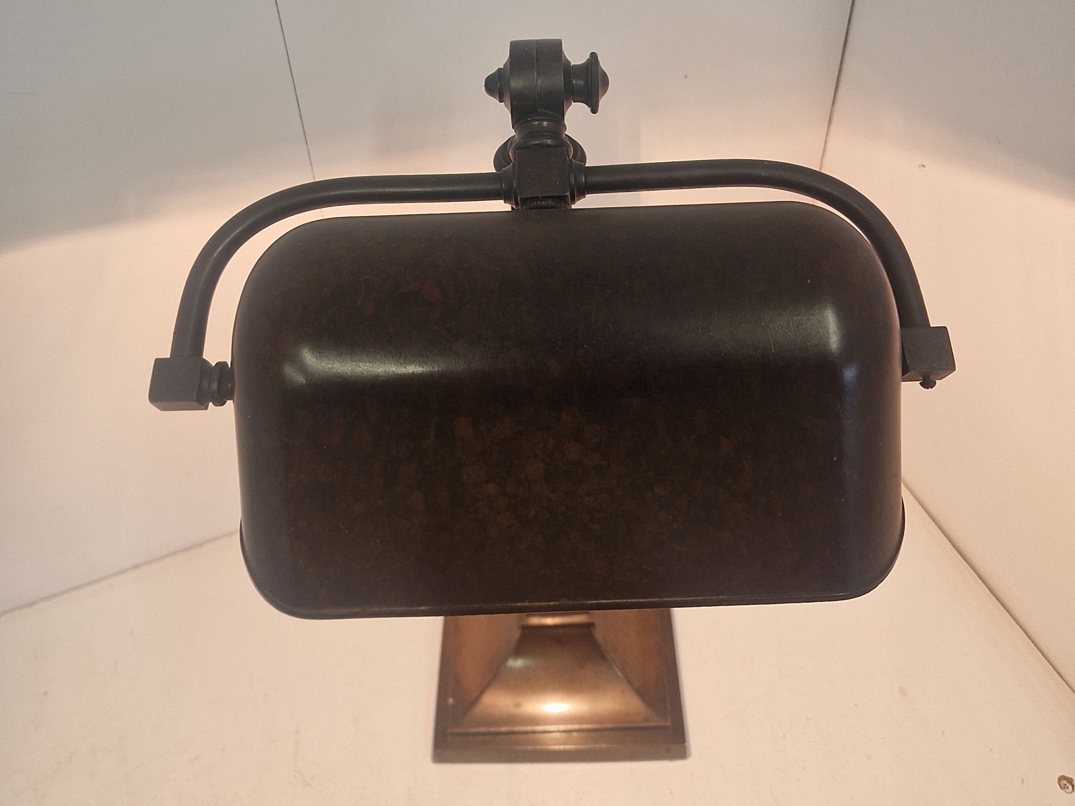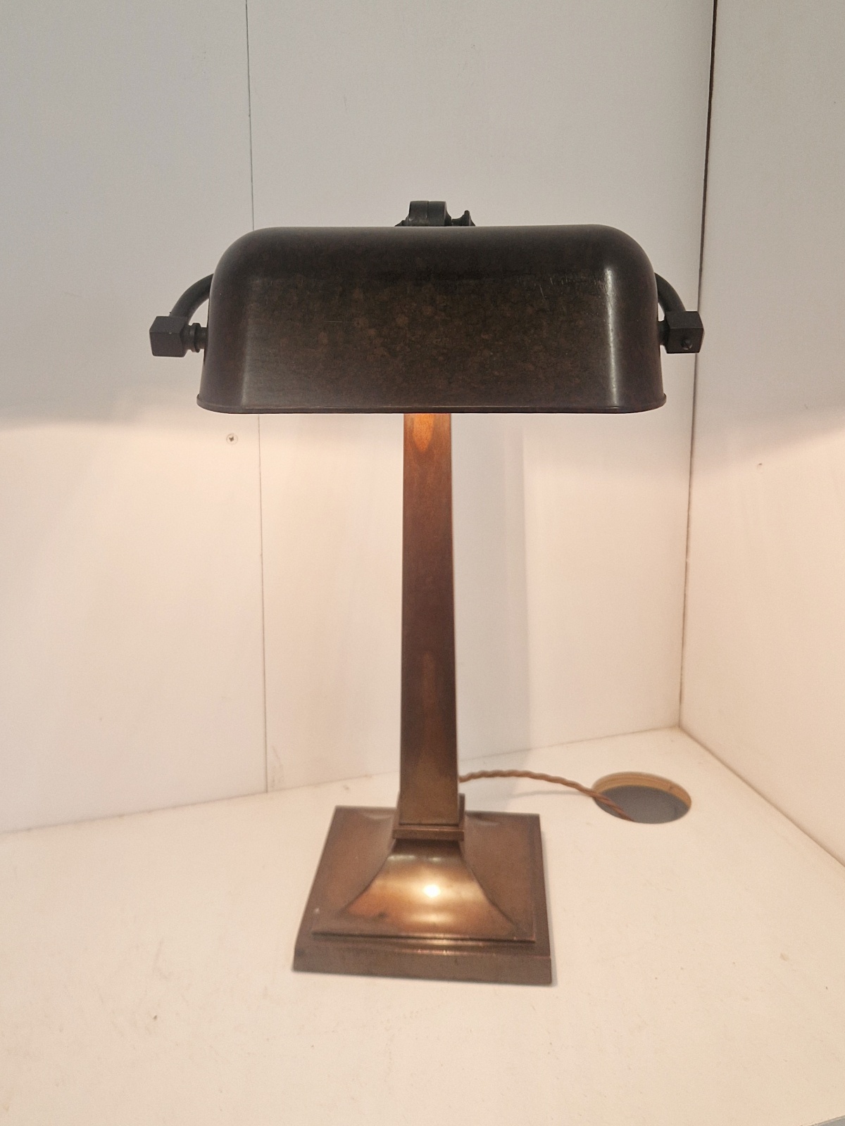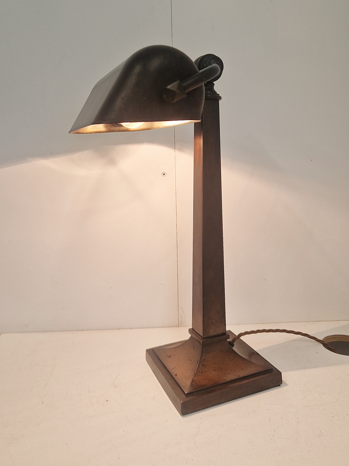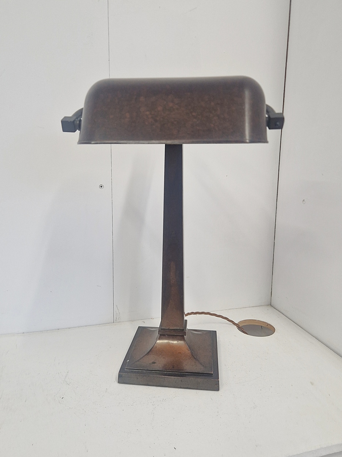 Product Code: LG769A fabulous quality and rare multi-adjustable “Banker’s” desk lamp. The large lamp maintains it’s original bronze-brass patina and original bakelite trough shade. England, c.1920.