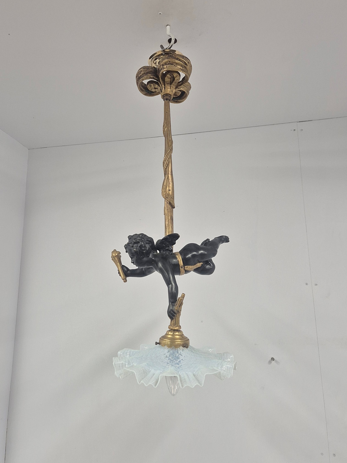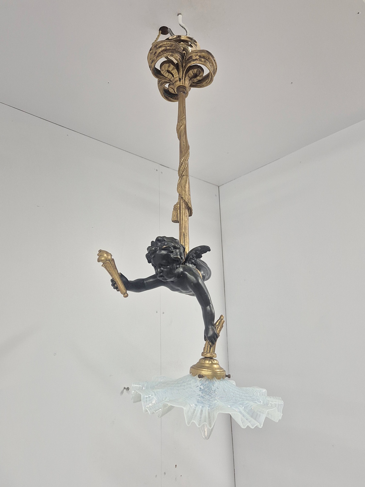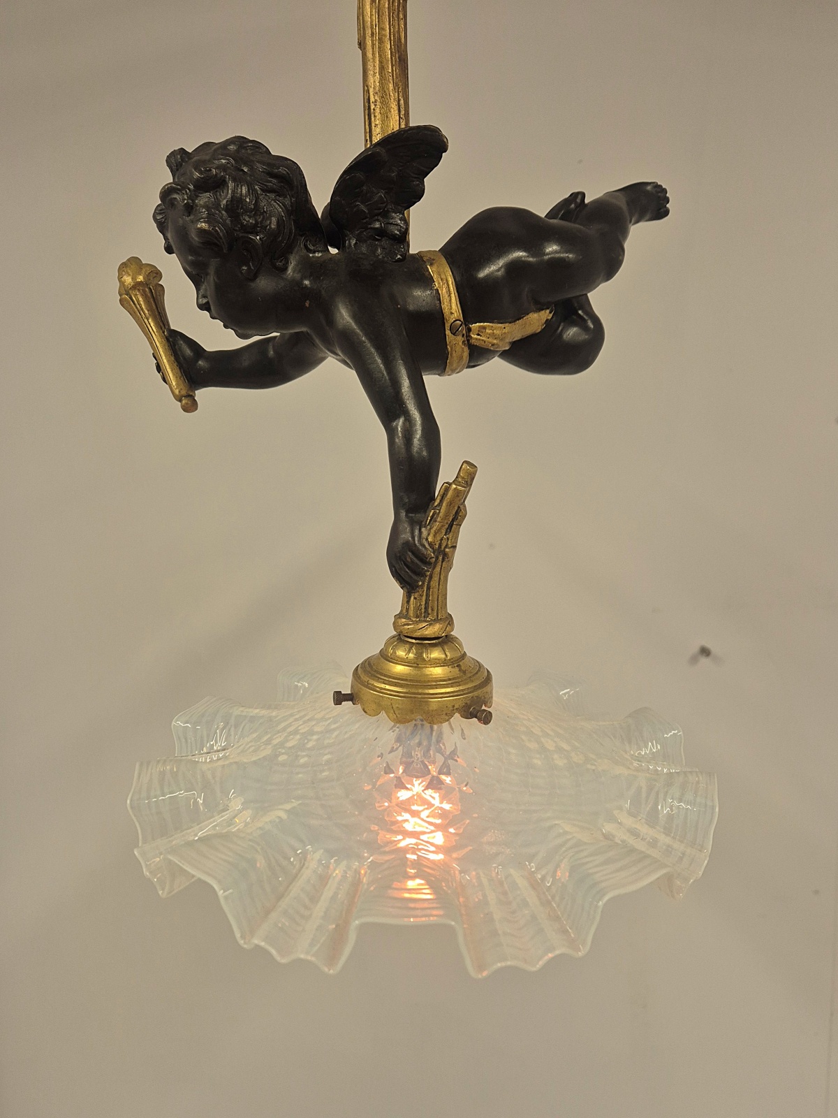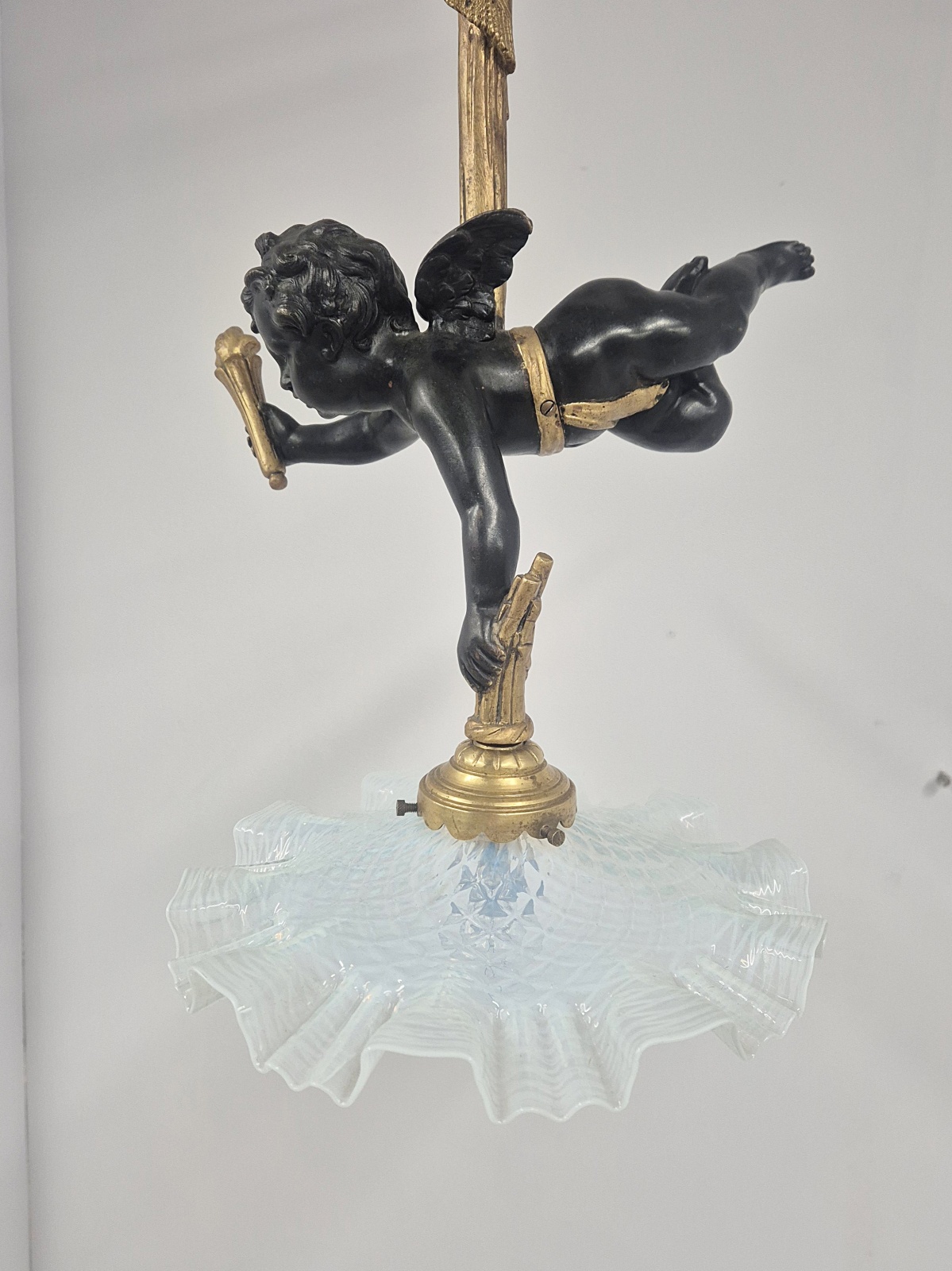 A large and impressive bronze cherub ceiling lamp. The central column with original antique guilding and supporting the dark bronze putto holding aloft a small torch and supporting an original period opalescent glass “coolie” lampshade; France, c1905.