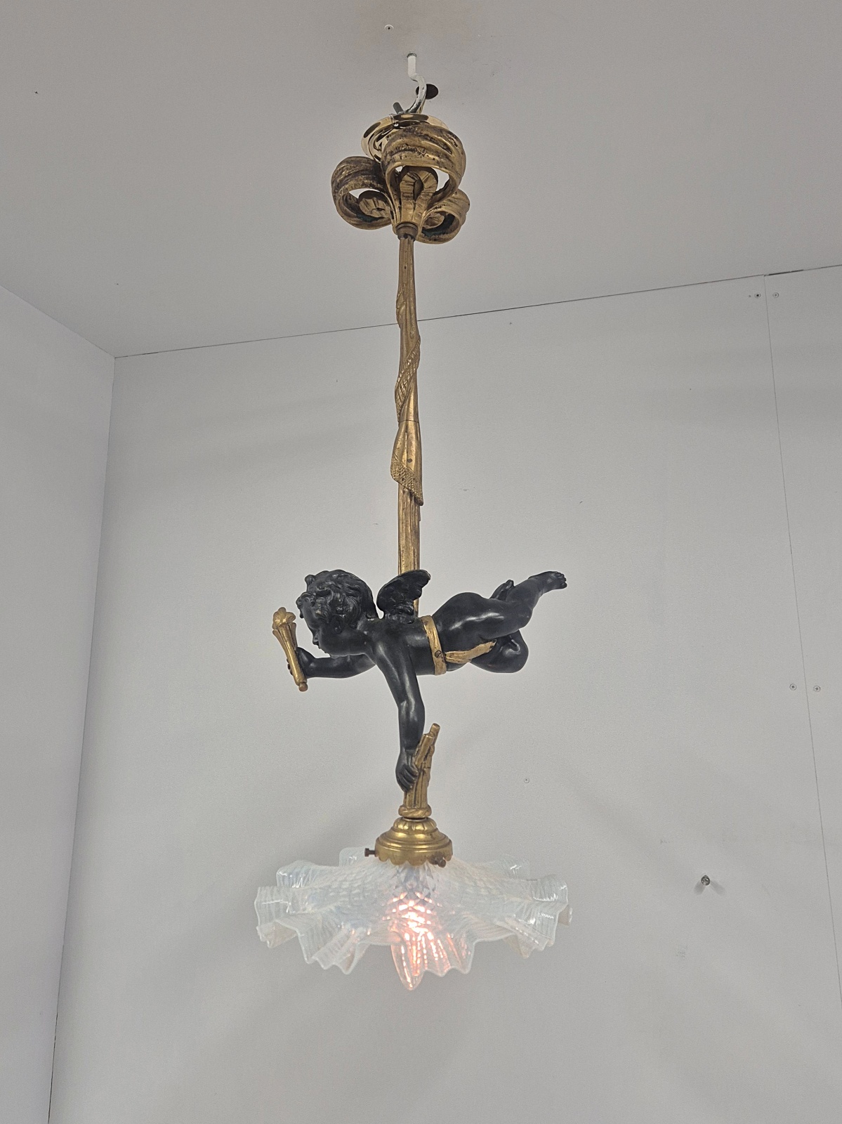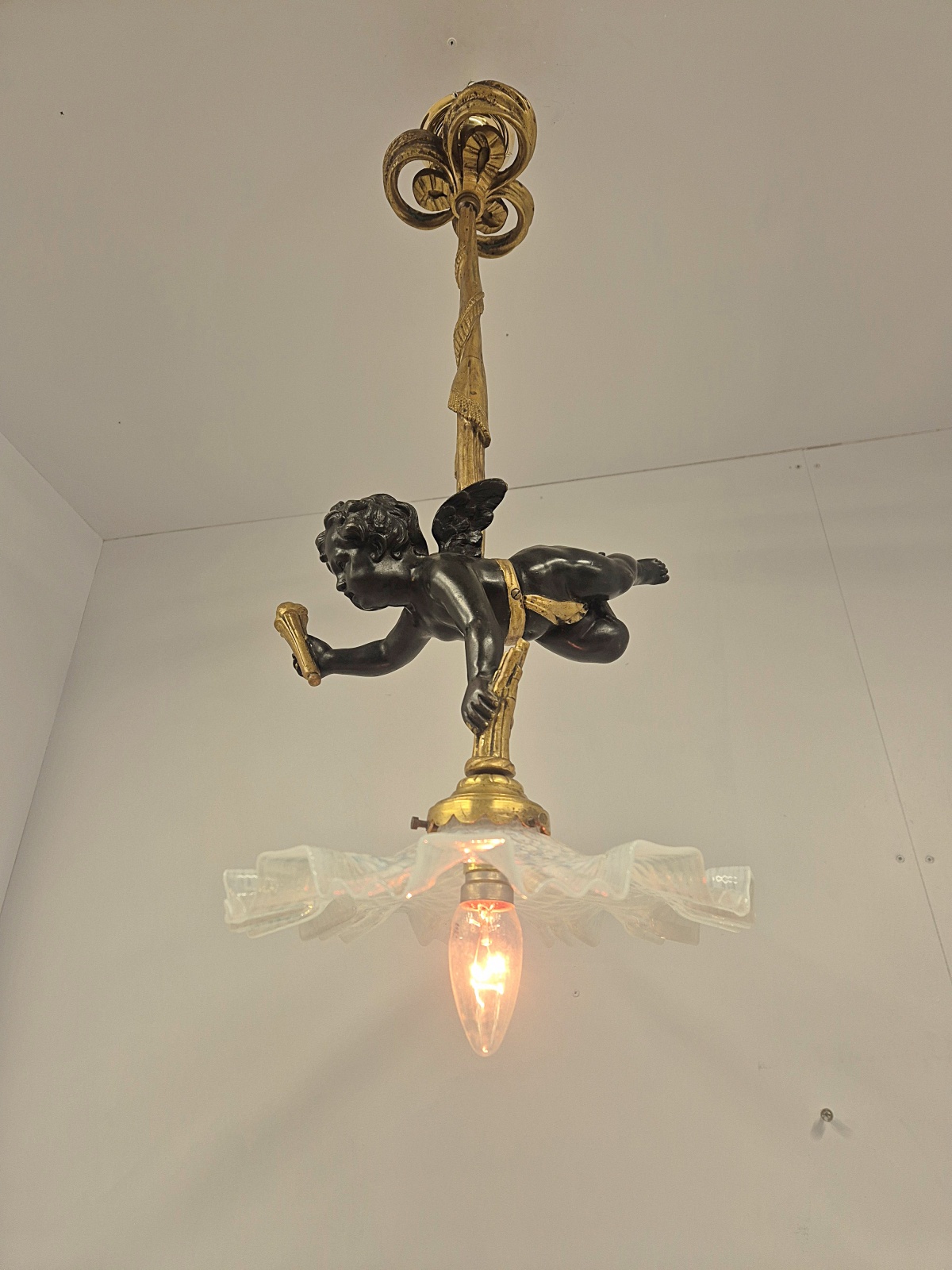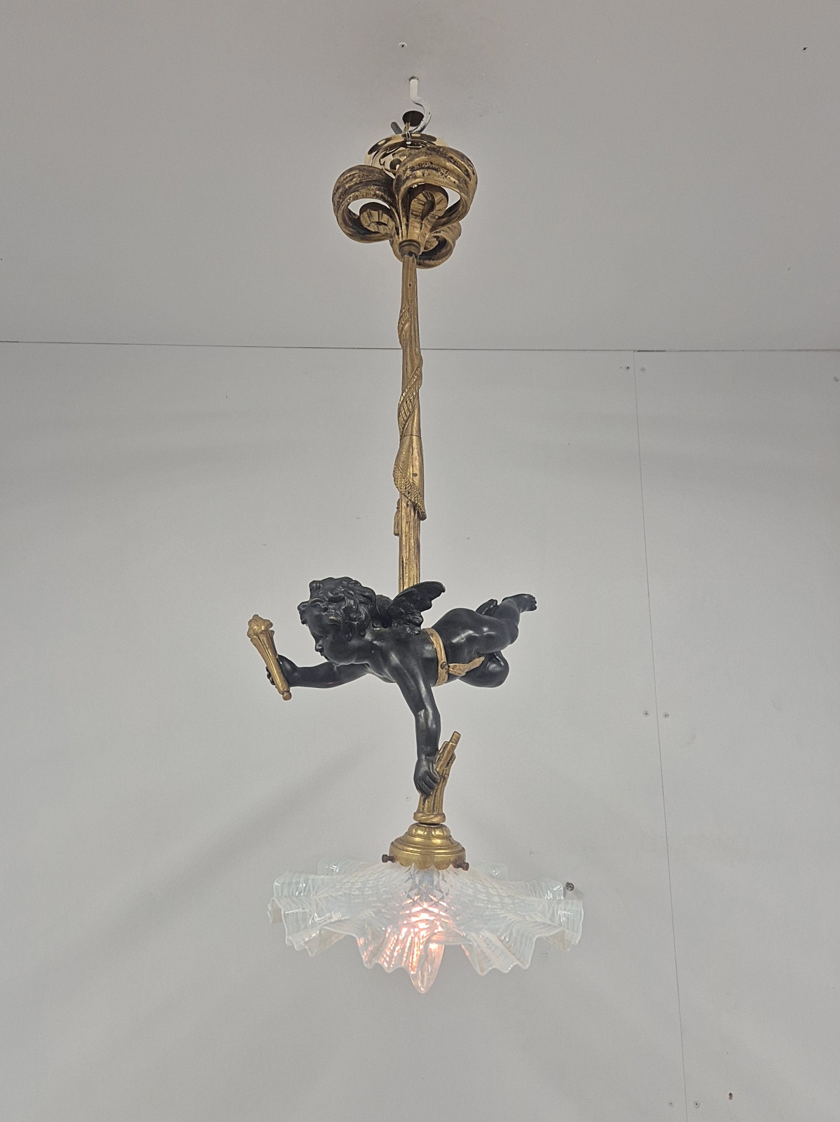 A large and impressive bronze cherub ceiling lamp. The central column with original antique guilding and supporting the dark bronze putto holding aloft a small torch and supporting an original period opalescent glass “coolie” lampshade; France, c1905.