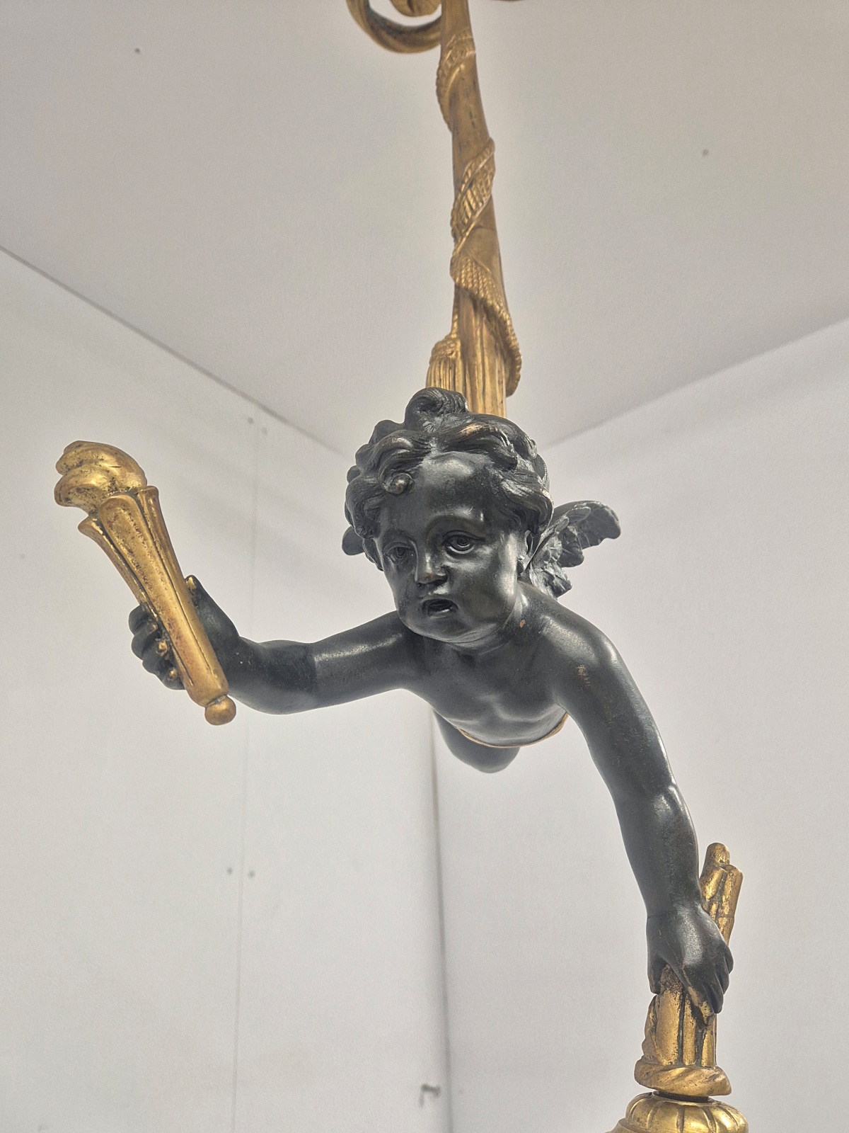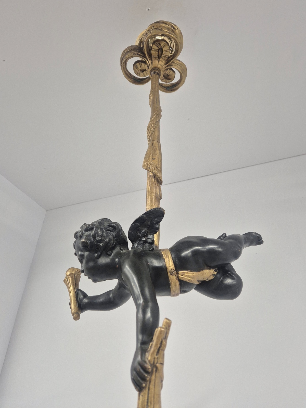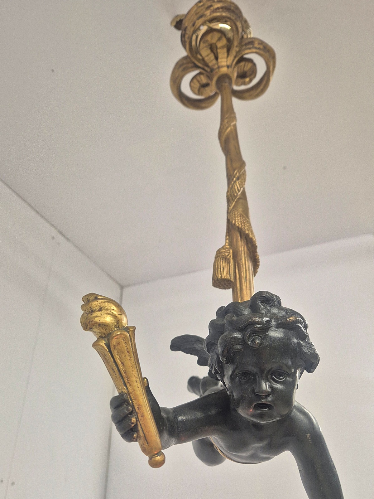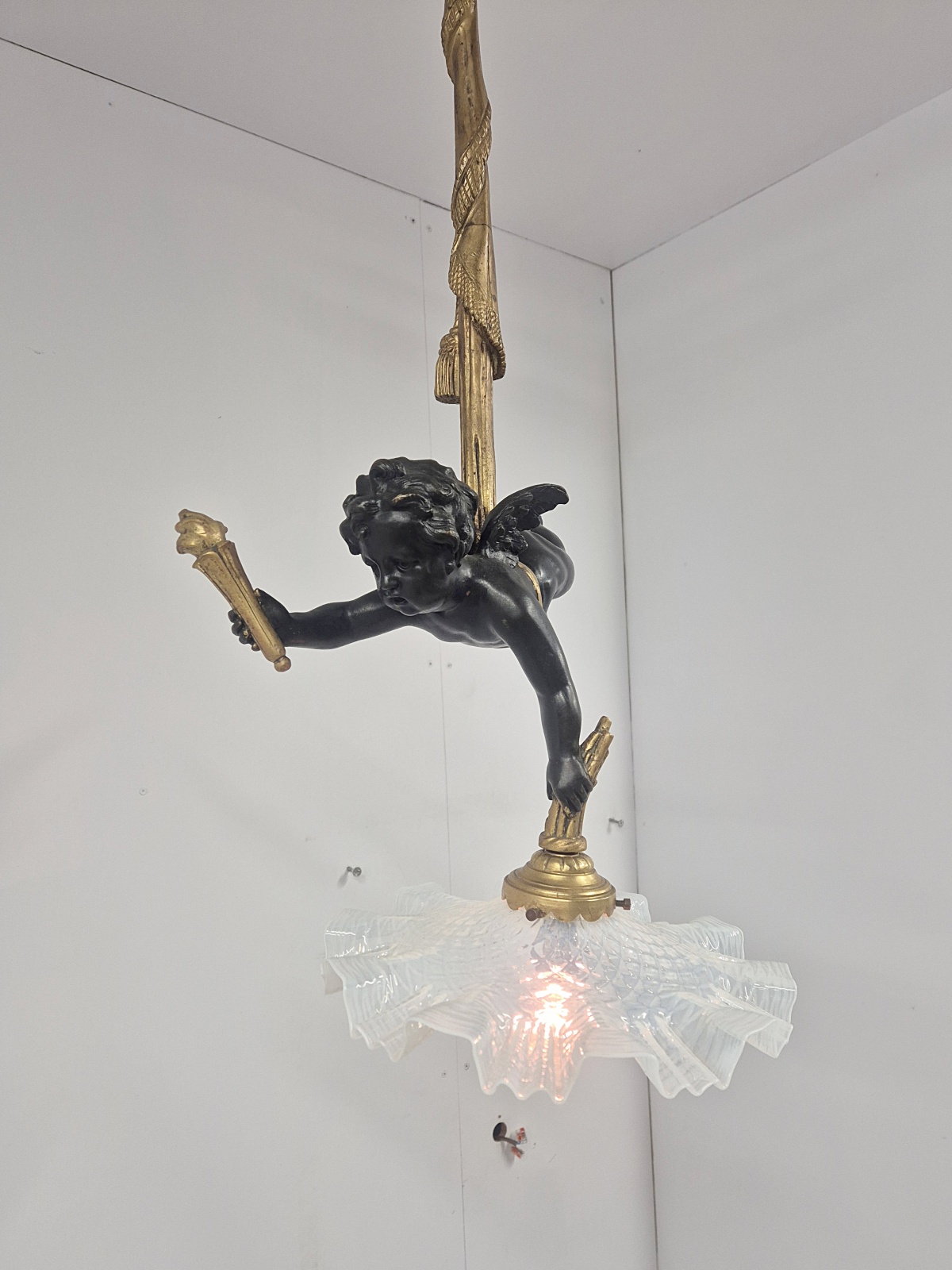 A large and impressive bronze cherub ceiling lamp. The central column with original antique guilding and supporting the dark bronze putto holding aloft a small torch and supporting an original period opalescent glass “coolie” lampshade; France, c1905.