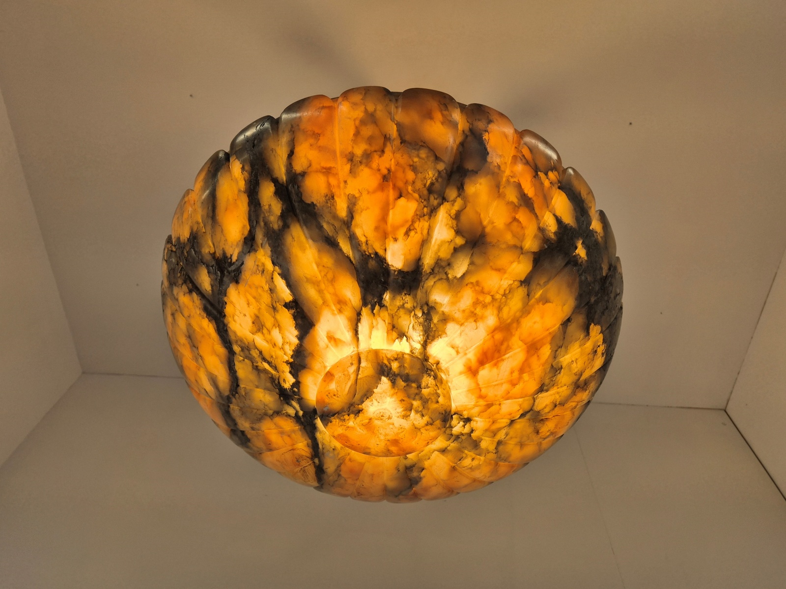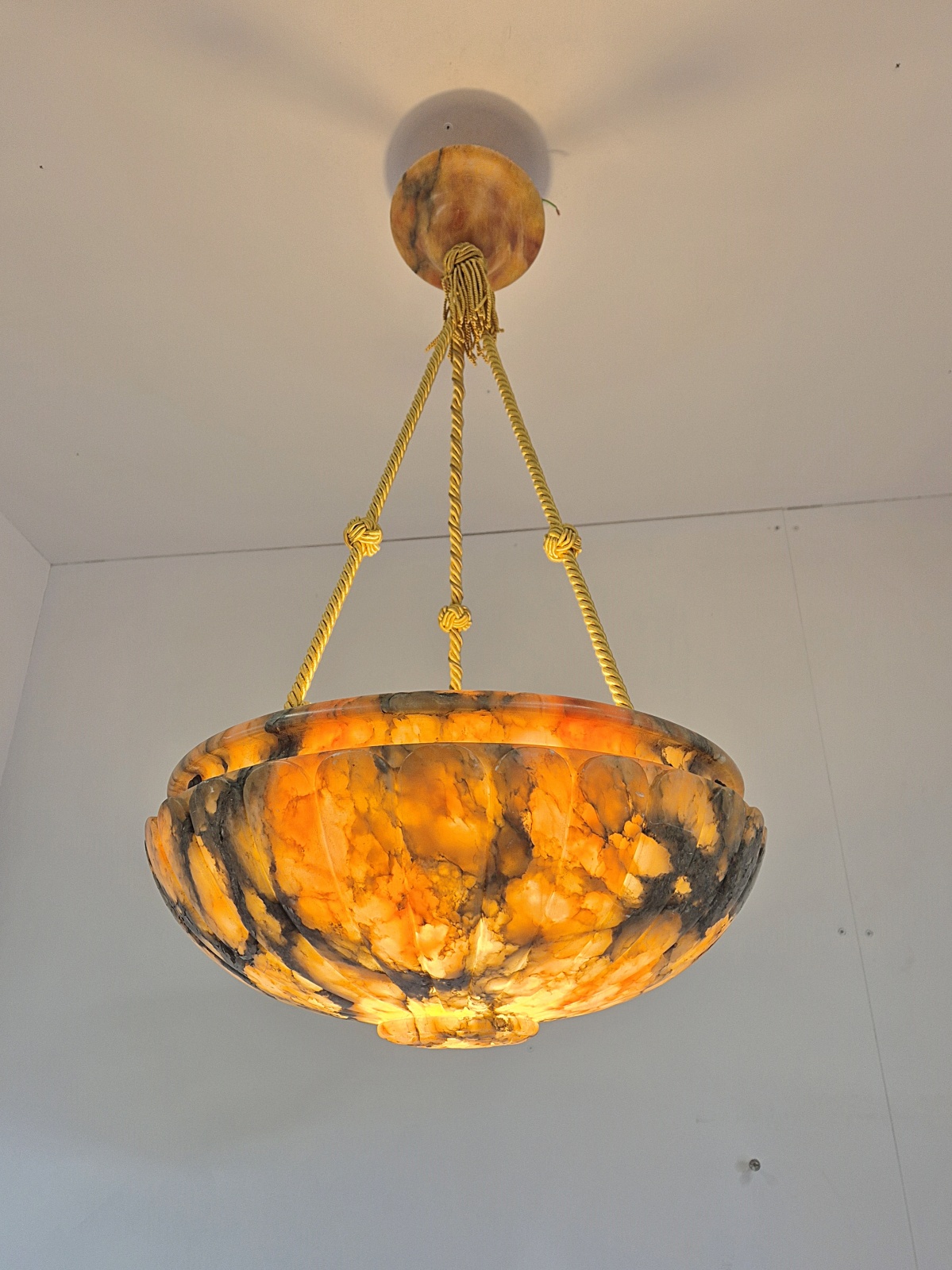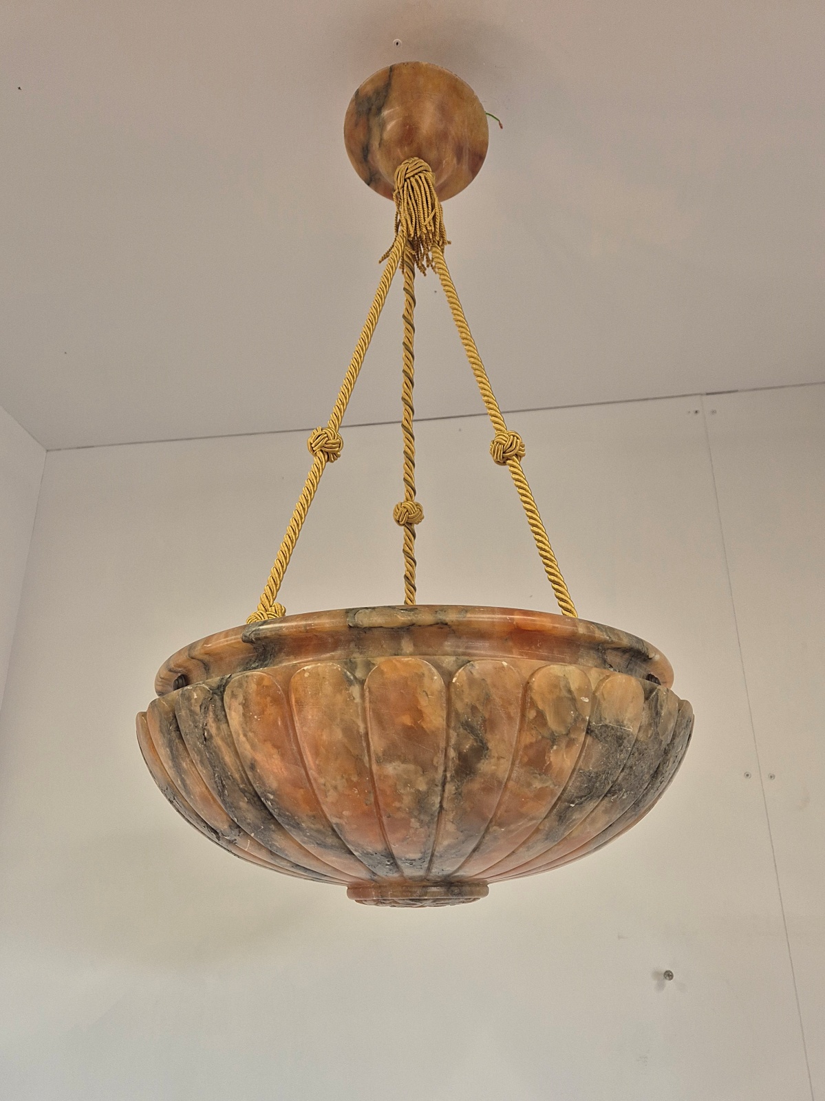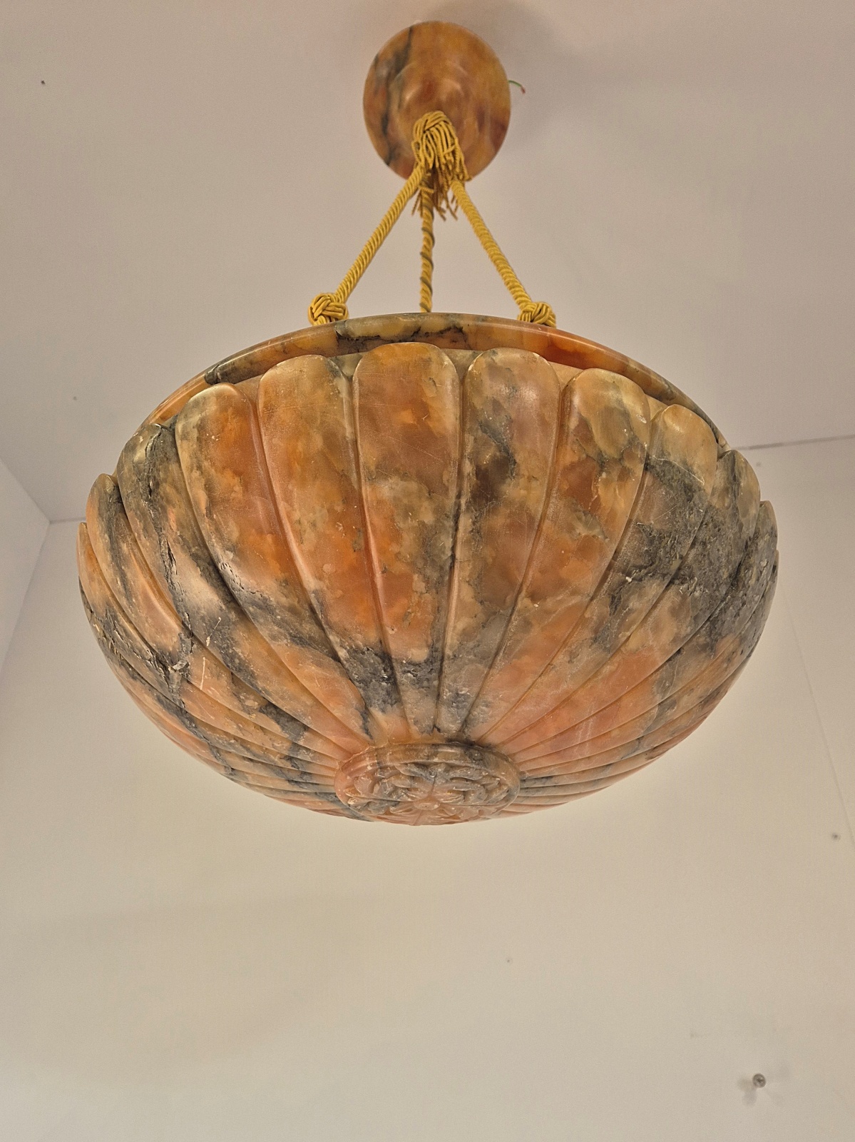 A fantastic carved alabaster plafonnier of very good quality, in deep tones of orange to very dark grey, with cords for suspension and original alabaster ceiling boss. French, c.1900.