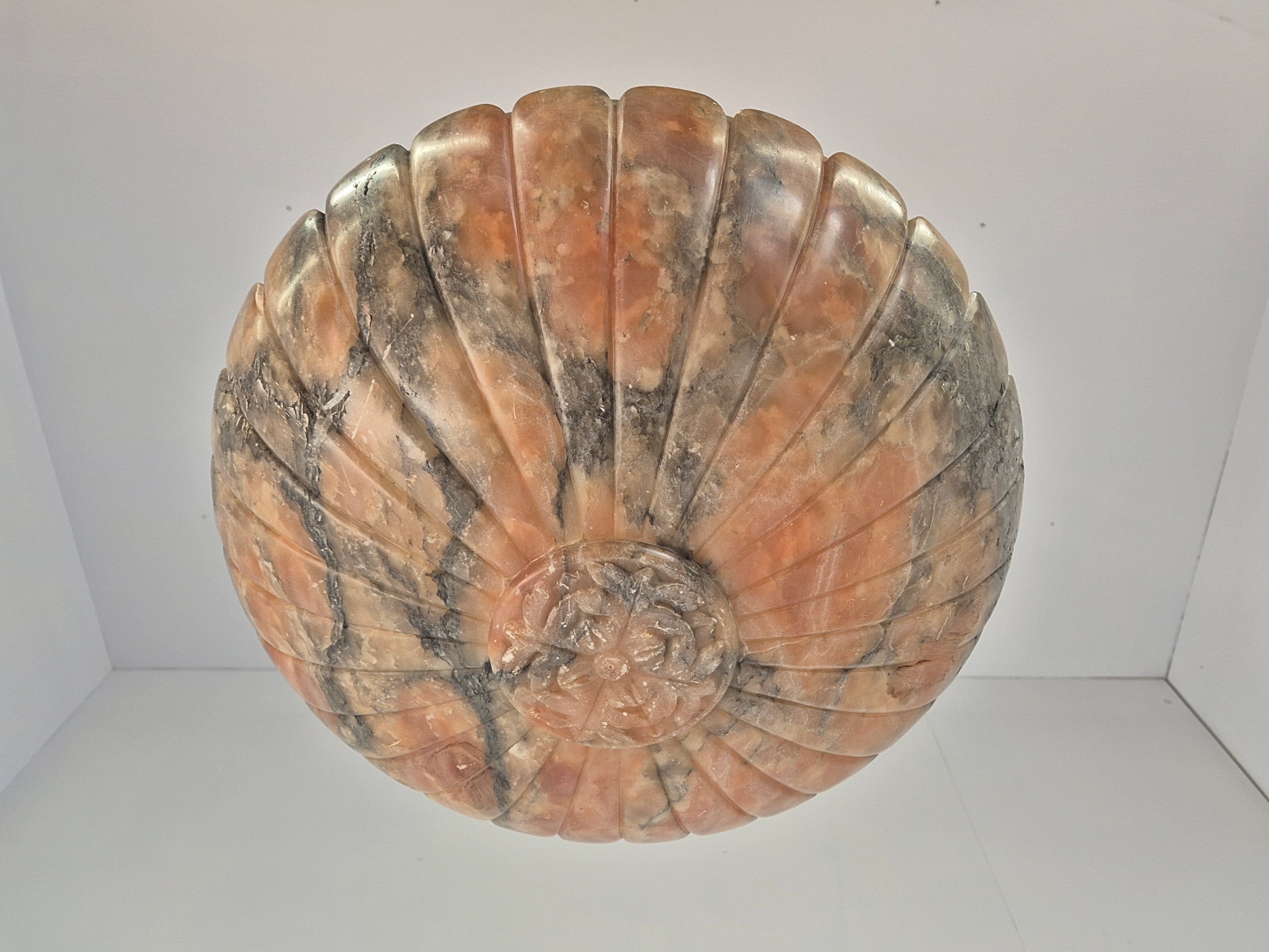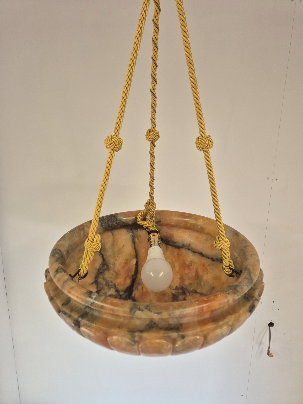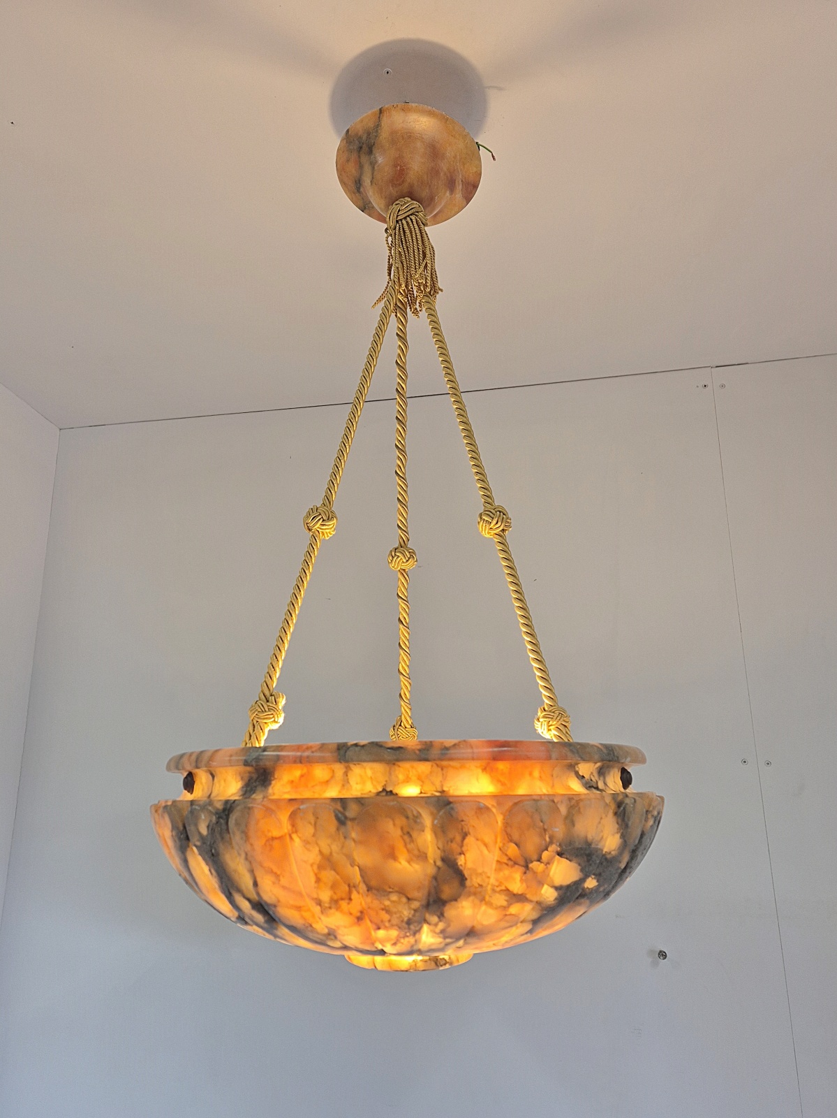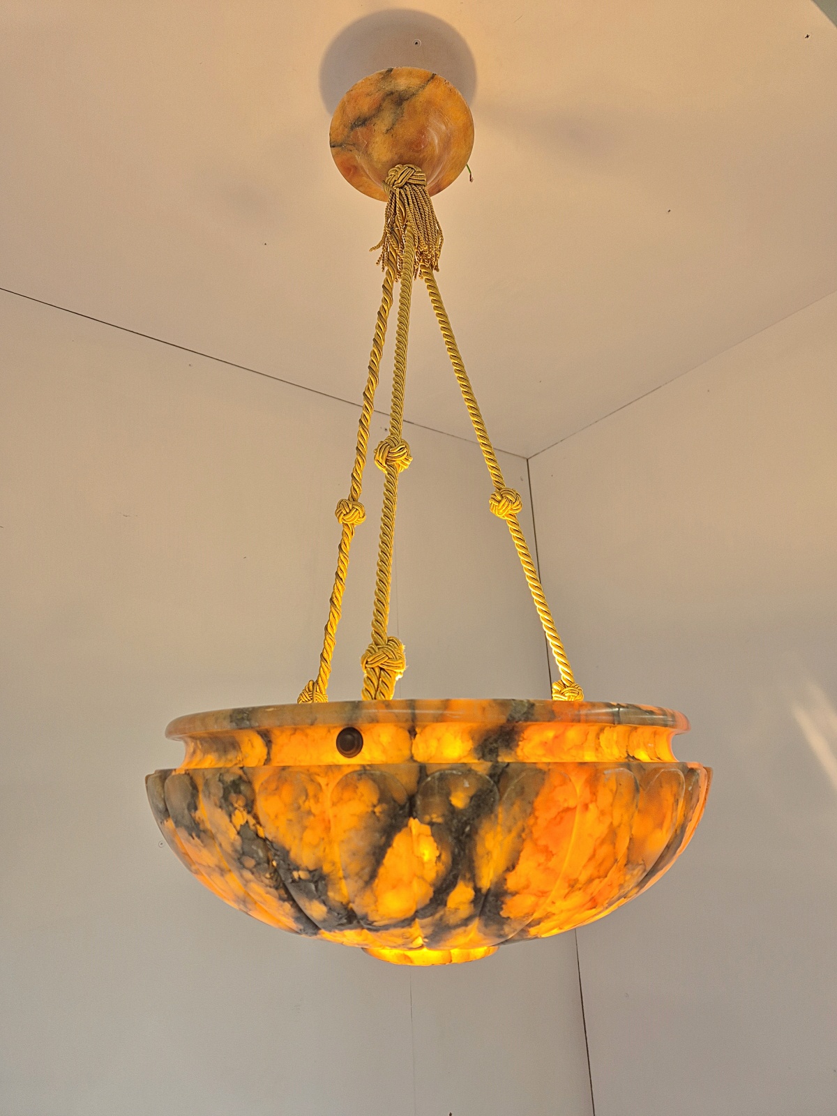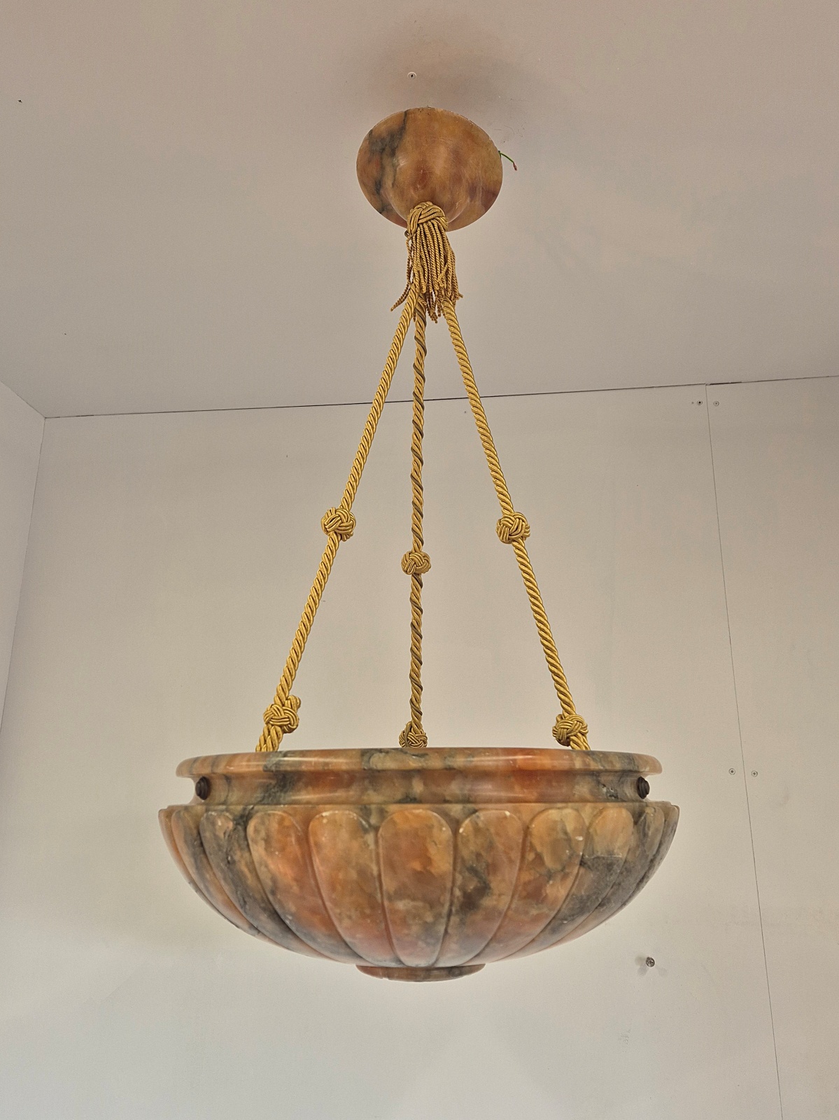 A fantastic carved alabaster plafonnier of very good quality, in deep tones of orange to very dark grey, with cords for suspension and original alabaster ceiling boss. French, c.1900.
