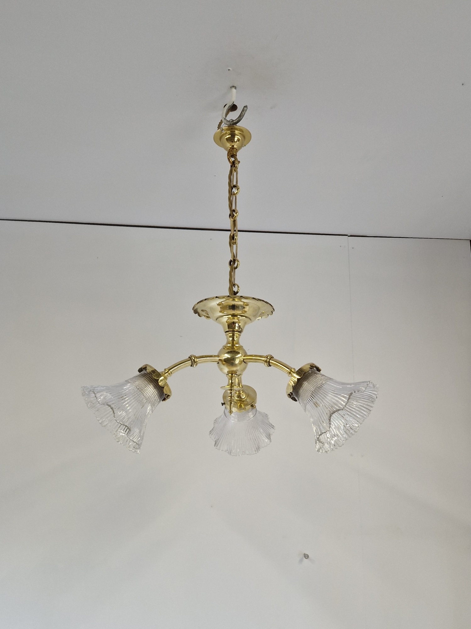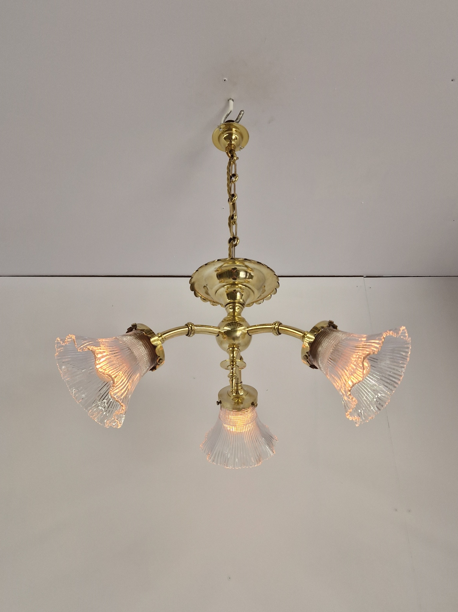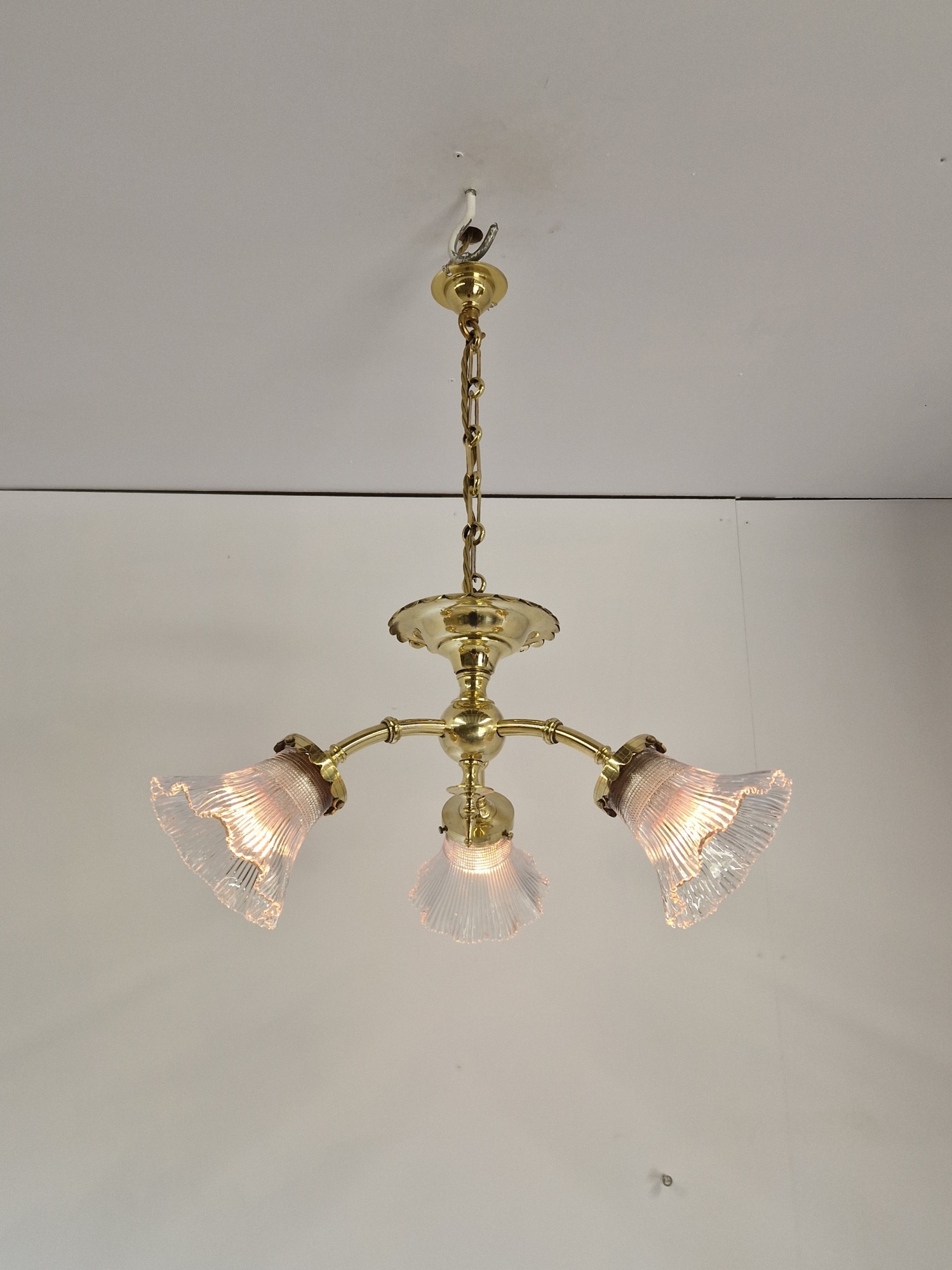 Product Code: LG690A petite good quality cast-brass three-branch hanging lamp complemented with original holophane lampshades by an unkown designer, France c1910-25