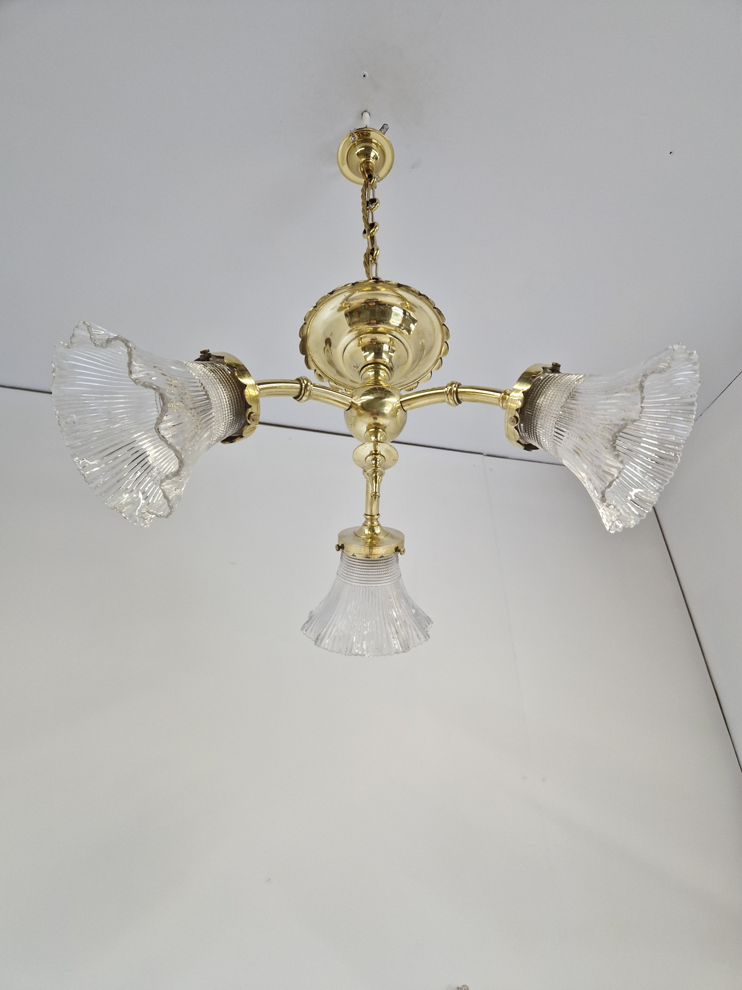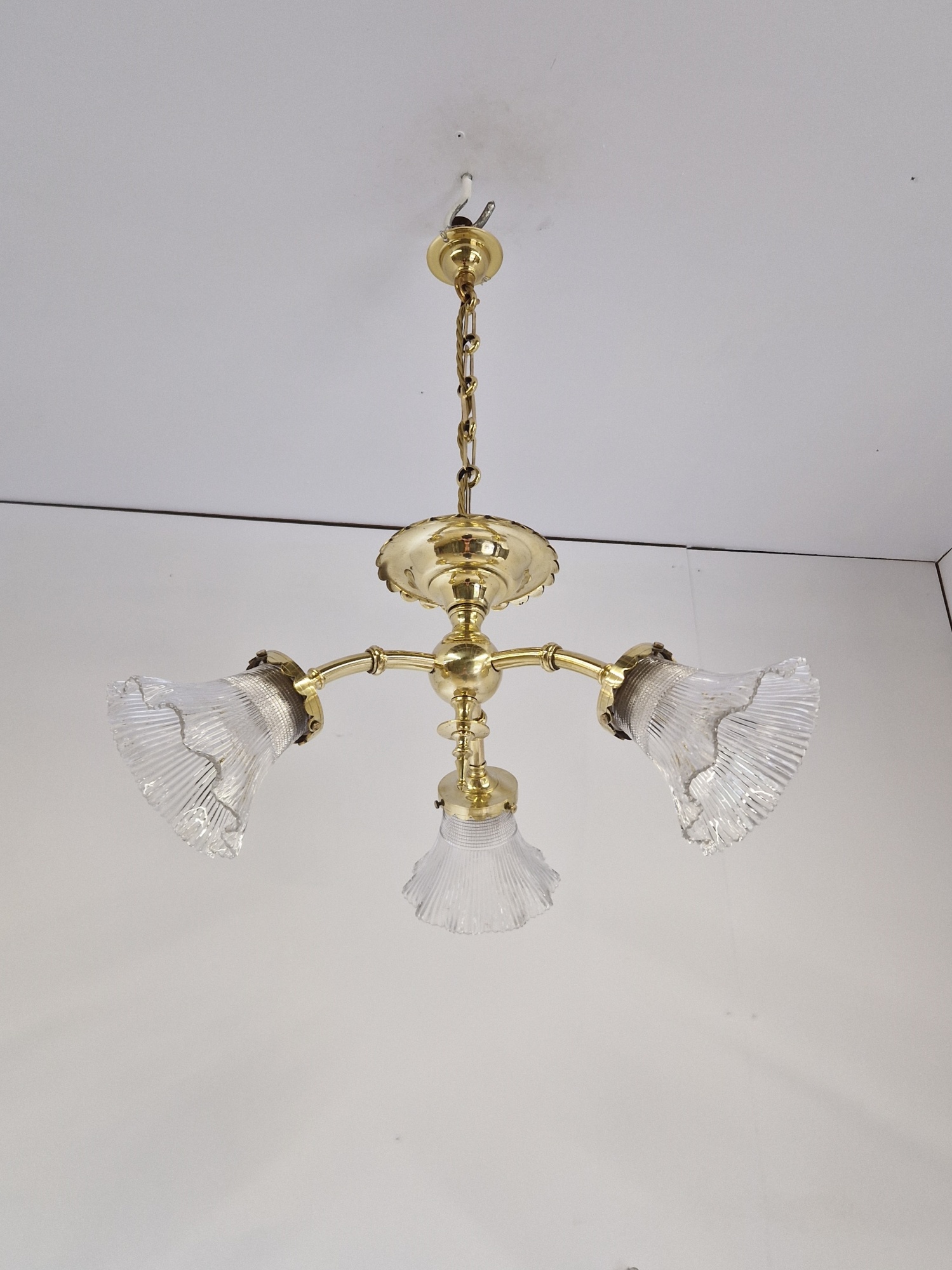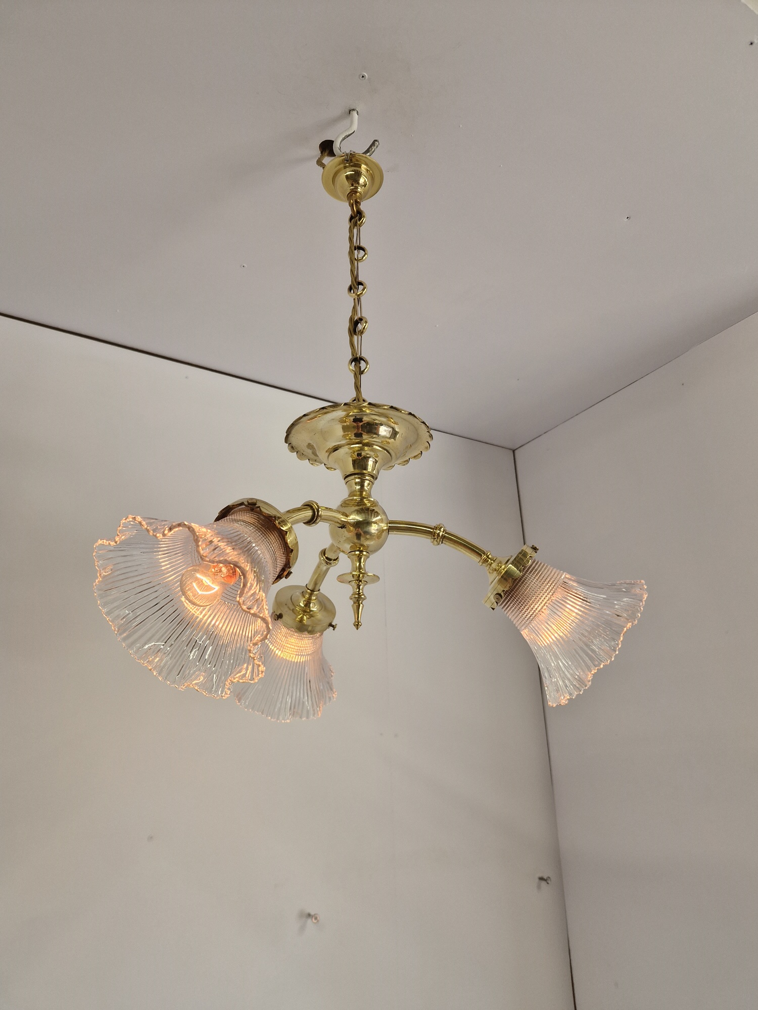 Product Code: LG690A petite good quality cast-brass three-branch hanging lamp complemented with original holophane lampshades by an unkown designer, France c1910-25